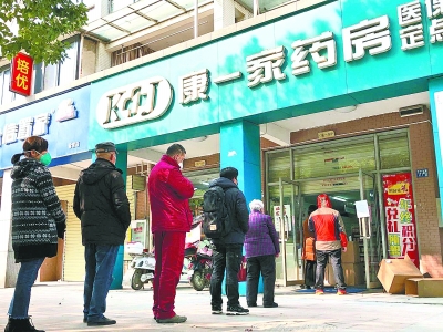 29日,汉口常青花园小区十余家药店相继开始营业,居民有序地排起长队购买防疫用品 长江日报记者刘斌 摄 |