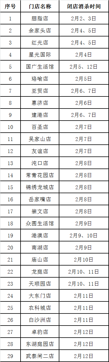 武商量贩相关工作人员在接受长江日报-长江网记者采访时表示,商超是当前人员特别集中的地方,而且也有少数感染的问题和比较严重的隐患,根据疫情防控总体要求和全市消杀工作安排,也为了切实、有效、持续保障广大市民的购物安全和身体健康,几大商超正在有计划地分区域、错时开展正常消杀工作。“消杀工作完成后,商超将迅速恢复正常营业,根本不存在长期停业的问题”,该负责人同时解释,为了缓解少数商超短时停业给居民造成不便的问题,几大商超之间约定,消杀期间,其周边商超将相应延长经营时间,适度增加蔬菜等供应规模,以满足市民生活需要。
