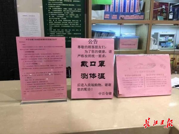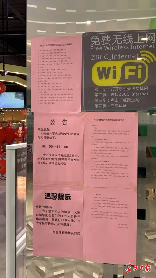 在中百仓储竹叶山店、横店店、万科嘉园店等门店门口,31日上午已经张贴有醒目的“告示”,告知市民目前营业时间,即10:00—17:00,同时超市承诺,“商品正常供应,绝不涨价!做好门店清洁消毒及通风工作。”