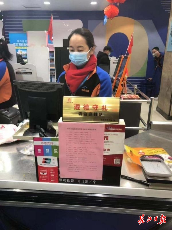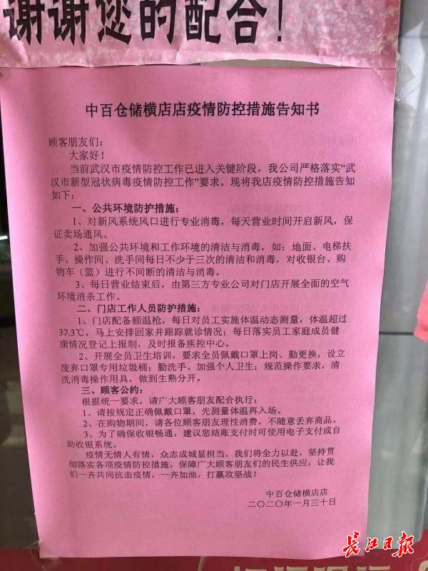 发布日期:2020-01-31 15:56:00 文章来源:长江网长江网1月31日讯(记者龚萍 通讯员张亮)1月31日,中百仓储公司全省158家门店均在门店内外张贴疫情防控措施告知书,告知市民超市的疫情防控举措、营业时间、服务承诺,让市民安心购物。