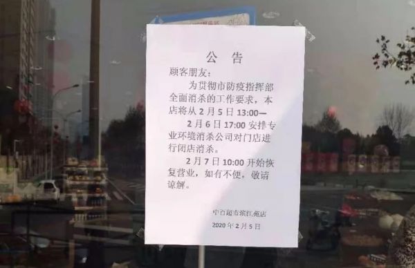 中百超市开始轮流闭店消杀,闭店前会张贴公告,消杀时间1~2天