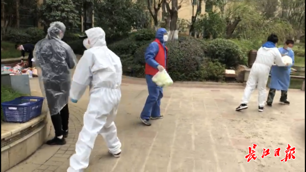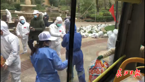 另外,政府协调的2辆公交车加上5辆面包车,一共7辆车,同时投入到了配送中。下午,超市工作人员和该小区志愿者们排成“接力”长龙,将套餐快速送到居民家门口。