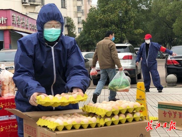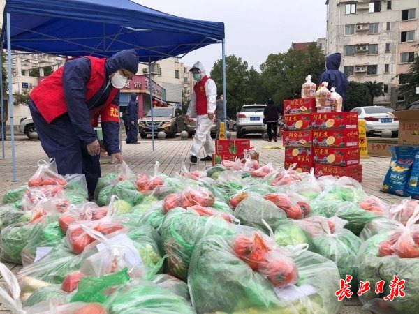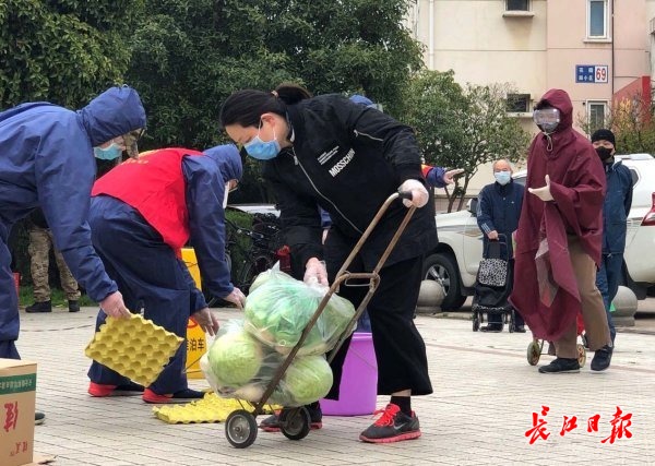 长江网3月6日讯3月6日,东西湖区常青花园三社区来自童梦幼儿园等单位数十名志愿者,坚守社区疫情防控各个岗位,在无接触投送点,志愿者搬运蔬菜、水果、分发物资,帮助困难家庭送菜上门,维护社区秩序,居民间隔排队有序领取生活物资。疫情期间,社区居民购物采用多种渠道,政府补贴十元菜、农投集团、多点等网上团购,“菜篮子”品类丰富。
