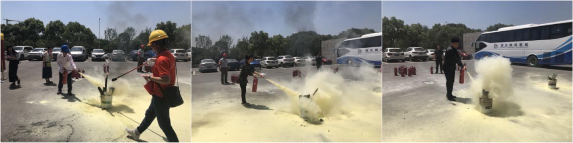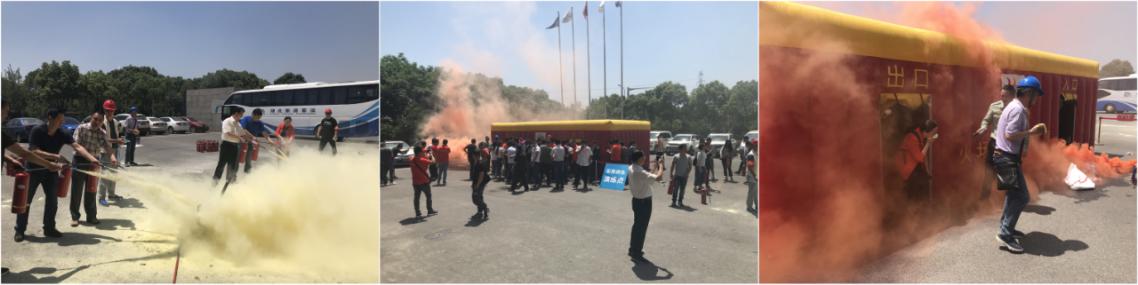 上午10:30结束理论培训后,全体参训人员按照培训活动安排,到预先指定地点有序进行消防器材实操培训。现场由培训教官对干粉灭火器的结构进行讲解,使用方法进行指导,然后参训人员排队分批次使用干粉灭火器对现场模拟火点进行灭火,亲身感受在火场应该如何使用正确消防设备。同时另一处设置模拟火灾现场逃生项目,通过架设充气帐篷房间,放置环保无毒烟雾弹,模拟火灾现场烟雾弥漫环境,让参训者体验正确逃生自救方法,克服恐慌心理。