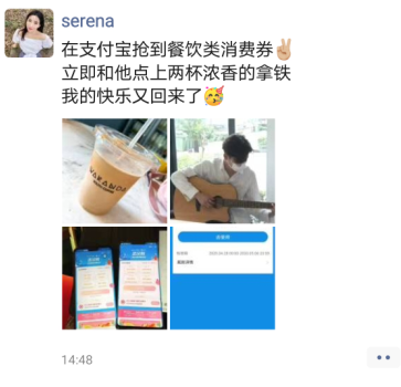 与首期不同的是,本次领券后,即刻可以使用。市民韩女士来到咖啡馆,选择了餐饮类消费券,领券成功后,立即给自己和朋友点上了两杯拿铁。“点杯咖啡,晒个朋友圈,我的快乐又回来了。”
