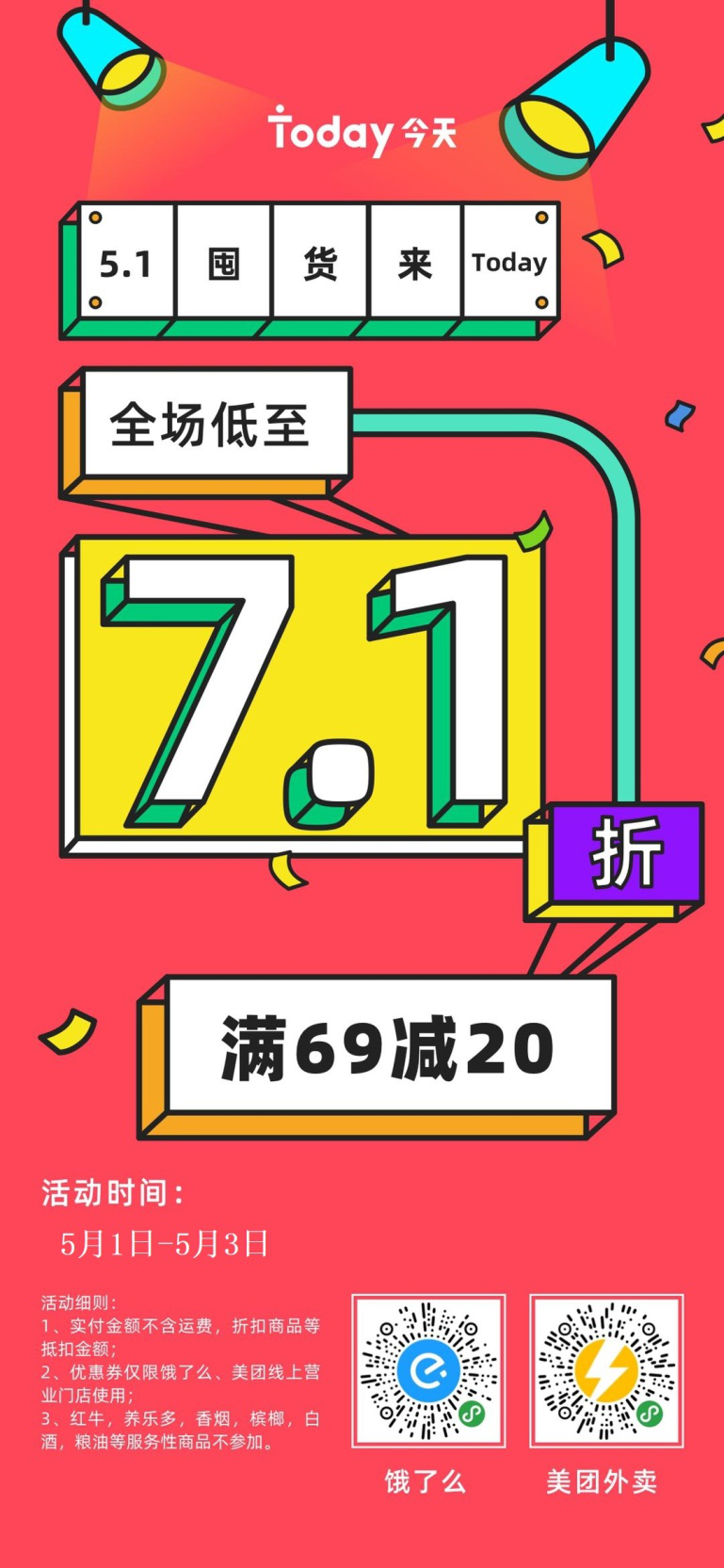 2、活动内容:活动时间为5月1日-5月3日,满69减20,全场低至7.1折。