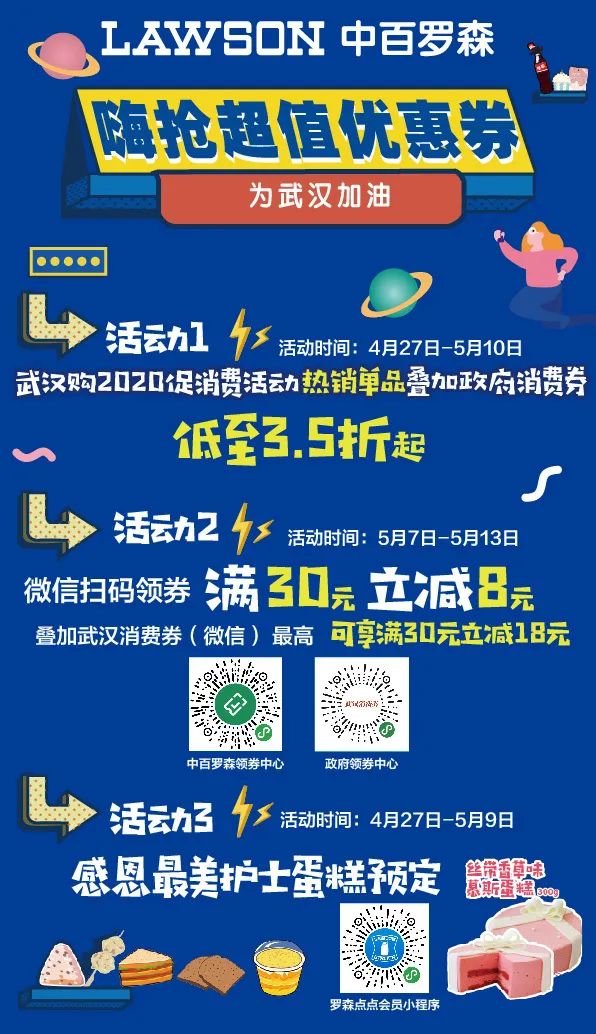 2、活动内容:4月27日-5月10日,武汉购2020促消费活动热销单品叠加政府消费券,低至3.5折起;5月7日-13日,微信扫码领券,满30立减8元,叠加武汉消费券最高立减18元;4月27日-5月9日,感恩最美护士蛋糕预定。