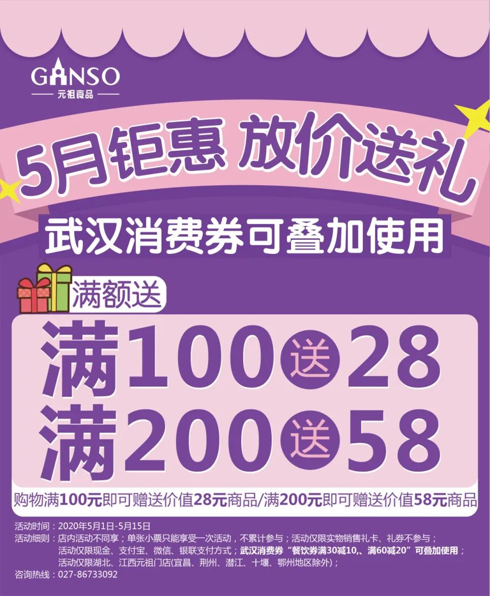 2、活动内容:5月1日-5月15日,购物满100元即赠送28元商品;购物满200元即赠送58元商品。可与武汉消费券叠加使用。