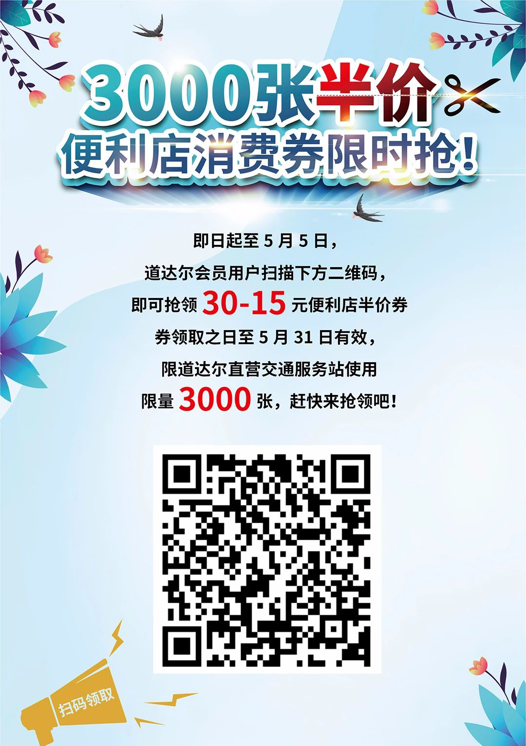 2、活动内容:即日起至5月5日,道达尔会员扫描二维码可抢领30-15元便利店半价券,券自领取之日至5月31日有效,限道达尔直营交通服务站使用。
