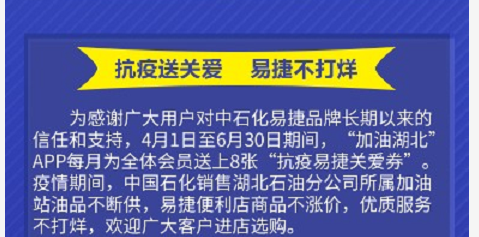 2、活动内容:4月1日至6月30日期间,“加油湖北”APP每月为全体会员送上8张“抗疫易捷关爱券”。