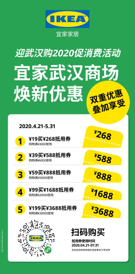 2、活动内容:宜家焕新优惠券,焕新优惠在微信快闪店2020.4.21-2020.5.31限时售卖,优惠券可在宜家武汉线下商场使用,有效期为2020.4.21-2020.7.31,本券不可与其它优惠共享(武汉消费券及荟聚五一优惠券除外)。4月30日-5月5日,宜家五一“满千返百”活动。