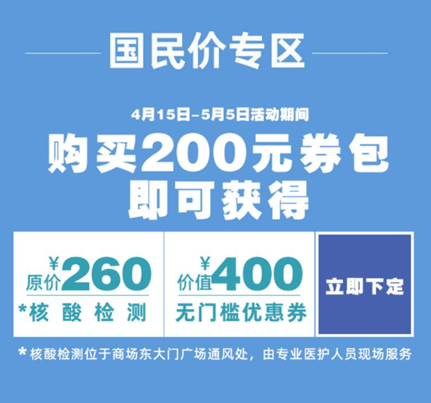 2、活动内容:4月15日-5月5日,购买200元券包即可获得核酸检测和价值400元无门槛优惠券。