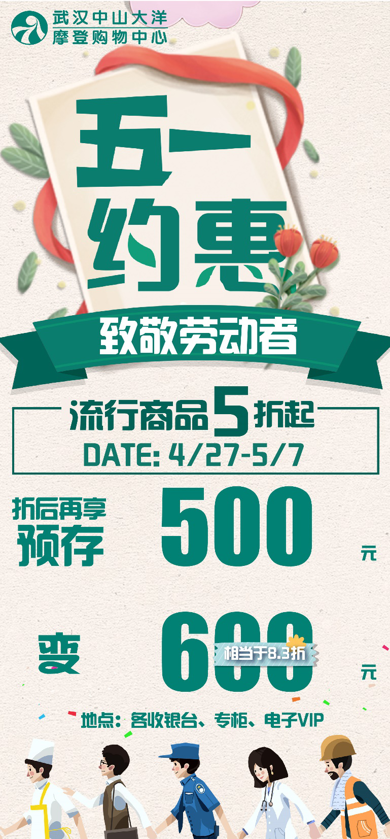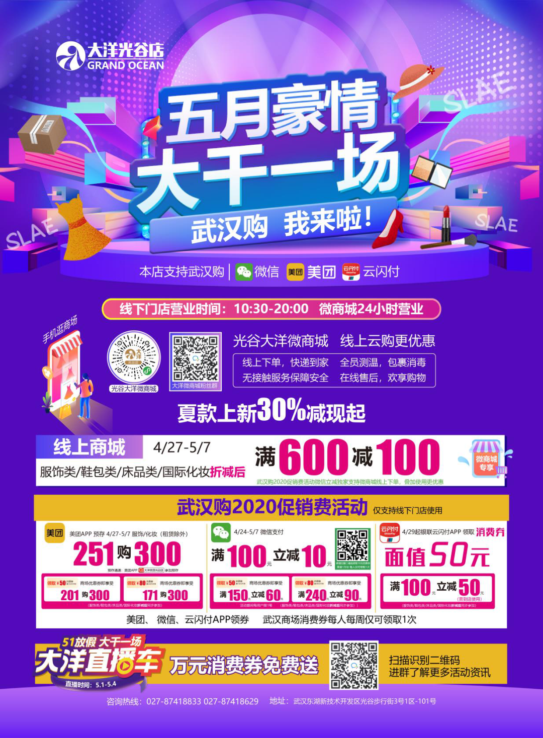 2、活动内容:4月27日-5月7日,政府商场消费券与大洋预存及品牌折扣同享;微商城“10元现金券”免费领;向劳动者致敬 感谢有你,医护人员凭参与防疫工作相关证明领取100元大洋购物现金券,非武汉居民持来汉交通票(3日内有效)和本人身份证可免费领取50元微商城无门槛优惠券;你购物我买单抽奖活动;VIP尊享礼。