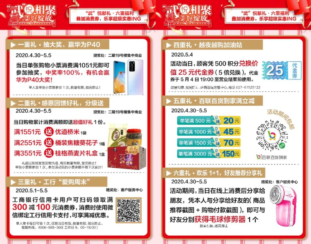 2、活动内容:4月30日至5月5日,线上 “百联百货到家”消费满立减;越夜越购加油站,5月4日,顾客凭500积分即可兑换价值25元代金券(5倍兑换),代金券于5月4日19:00至营业结束前使用;工行“爱购周末”,5月1-5日工商银行信用卡用户可扫码领取“满300减100元”消费券,消费时使用微信绑定工行信用卡支付,可享满减优惠;抽大奖、赢华为P40 ;感恩回馈,好礼分级送。
