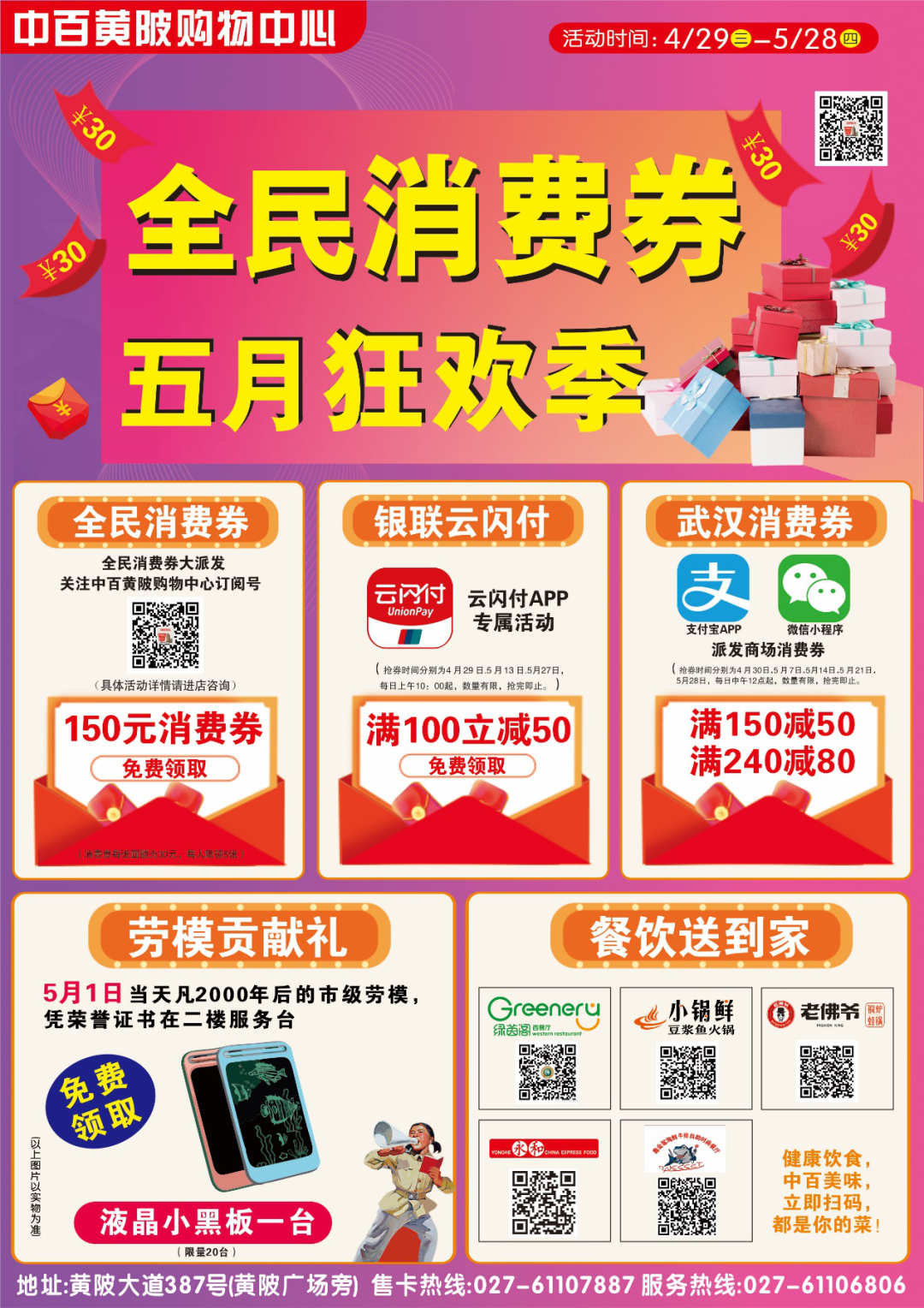 2、活动内容:4月29日-5月28日,全民消费券大派发,关注中百黄陂购物中心订阅号,免费领取150元消费券;餐饮送到家,健康饮食,中百美味,扫码外卖到家。