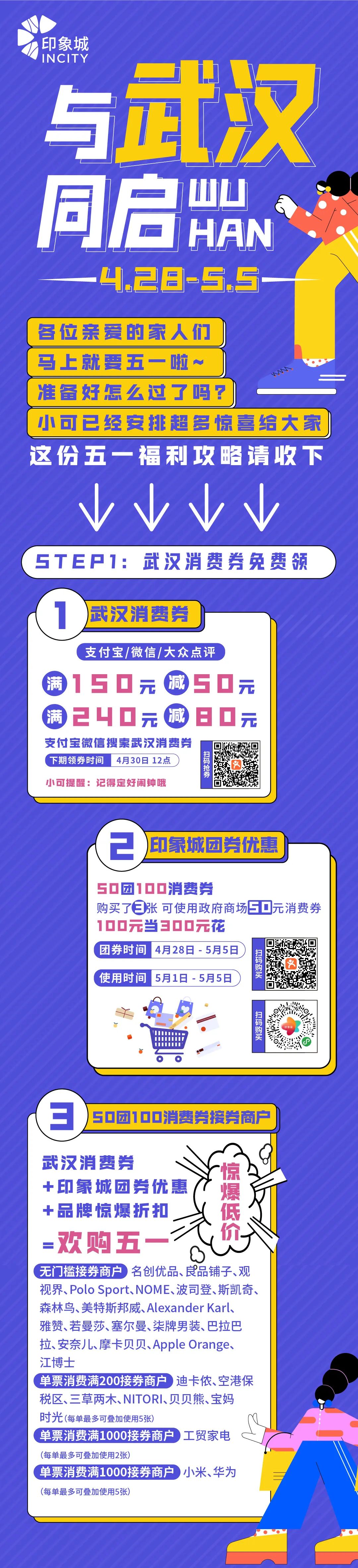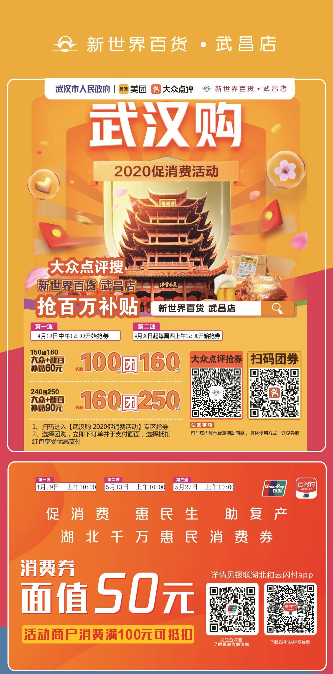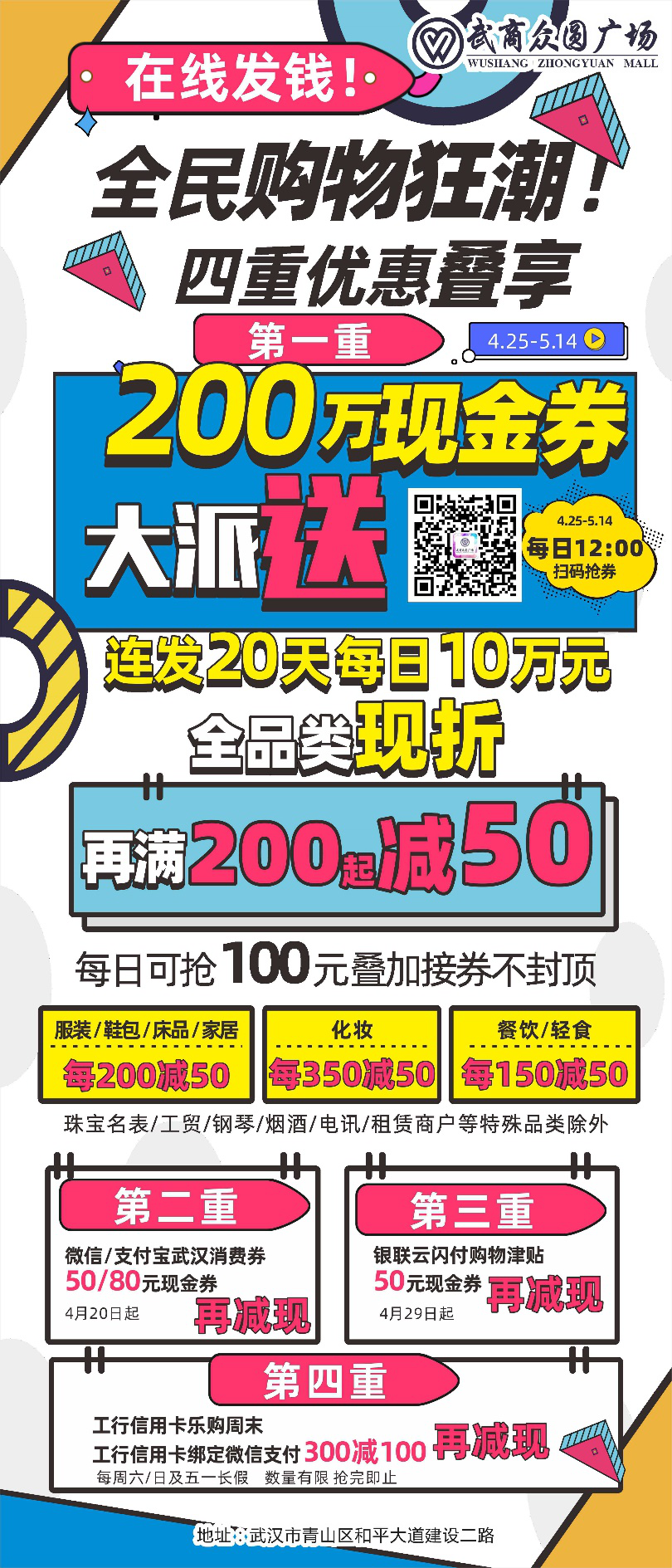 2、活动内容:4月25日-5月14日,每日12:00扫码抢券,200万现金券大派送,全品类现折,再满200起减50;可叠加武汉消费券、银联云闪付购物津贴、工行信用卡等减现活动。