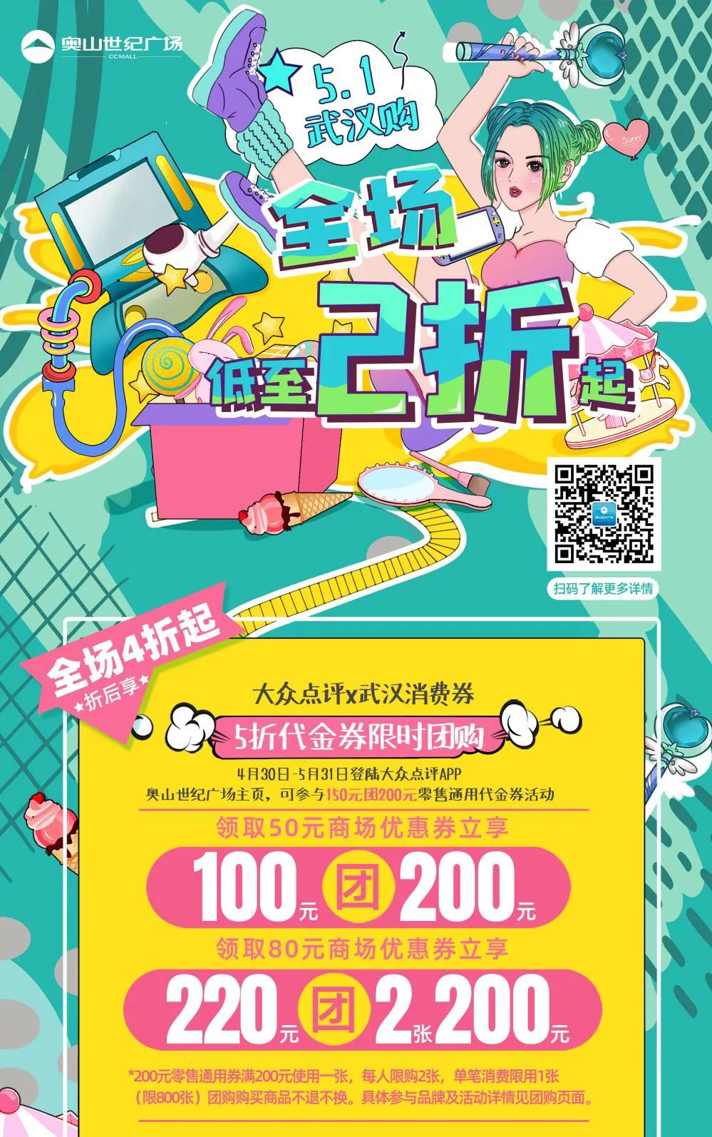 2、活动内容:4月30日-5月31日登陆大众点评APP奥山世纪广场主页,可参与150元团200元零售通用代金券活动,可叠加武汉消费券团券。全场4折起,满额返现。