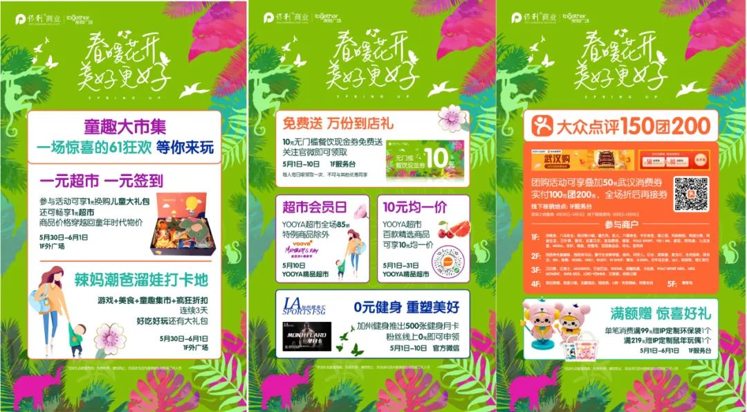 2、活动内容:童趣大市集、免费送万份到店礼、大众点评150团200等。