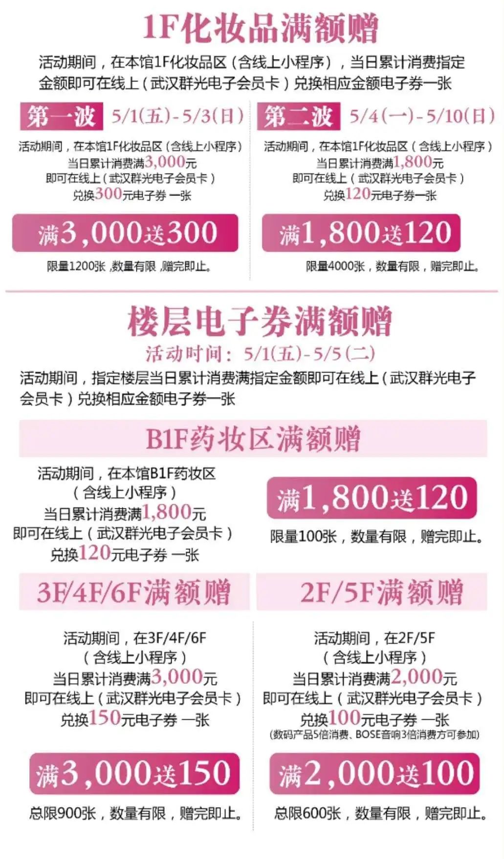 2、活动内容:5月1日-5日,全馆双倍积分;4月30日-5月10日,微信线上积分兑换;五一分楼层满赠电子券。