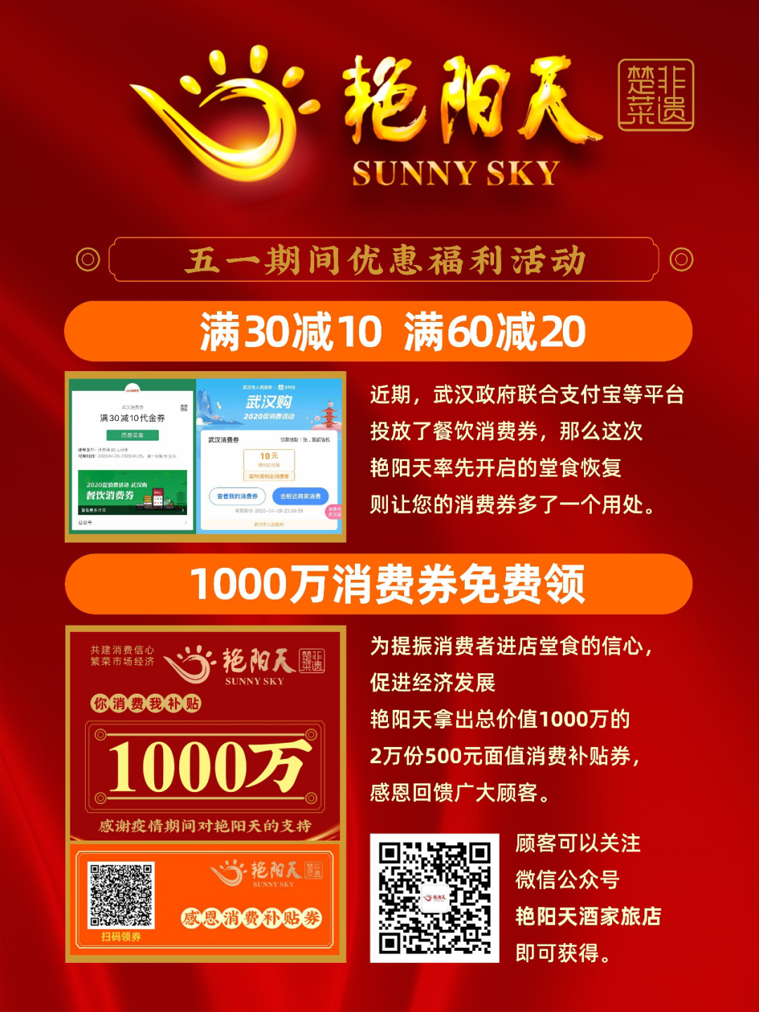 2、活动内容:免费发放1000万元消费补贴券,关注微信公众号“艳阳天酒家旅店”,即可获取。