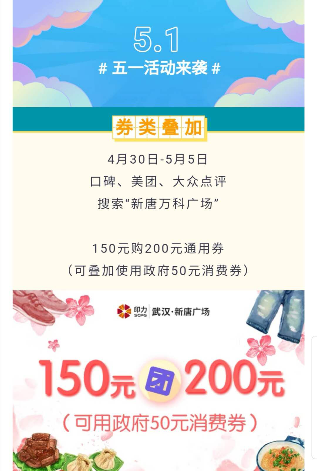 2、活动内容:4月30日-5月5日,口碑、美团、大众点评搜索“新唐万科广场”,150元购200元通用券(可叠加使用政府50元消费券)。