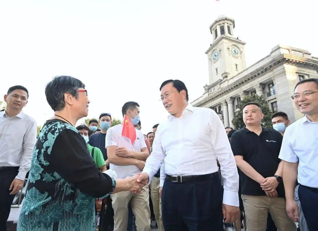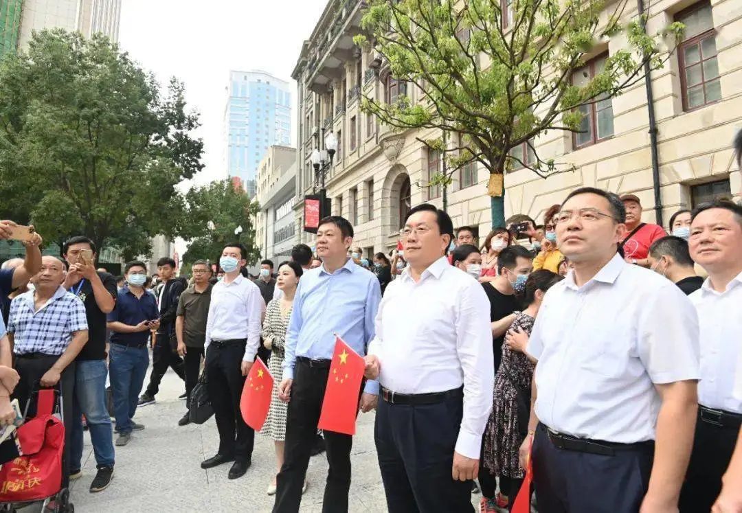 步行街广场上人头攒动,“大汉口风情”文艺展演等活动正在进行。王忠林与游客们一同挥舞国旗,致敬伟大祖国。有市民主动走上前来问好;有老人说,自己专门从家里过来看看,江汉路比以前更热闹了。王忠林与市民们互致节日的祝福,鼓励大家坚定信心,武汉明天会更好。
