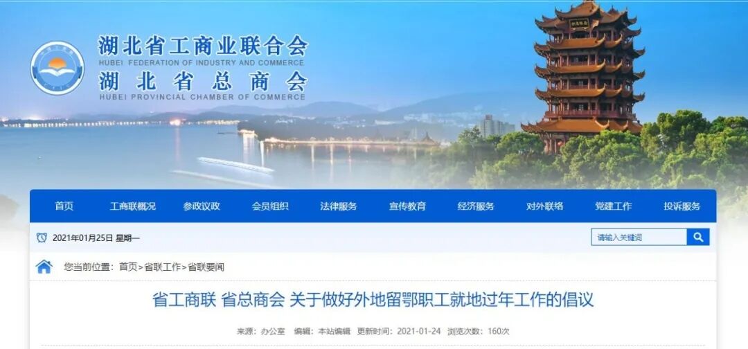 1月24日,湖北省工商联、湖北省总商会向全省各级工商联、商会组织、广大民营企业,发出关于做好外地留鄂职工就地过年工作的倡议。