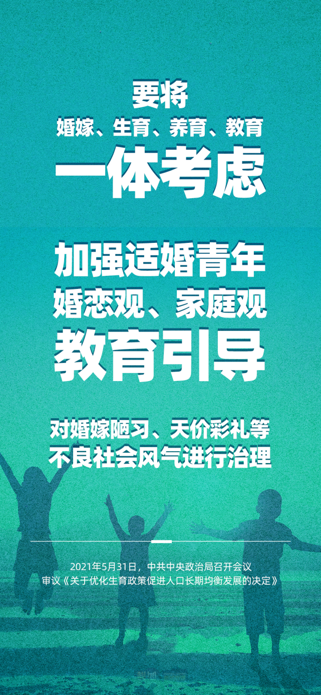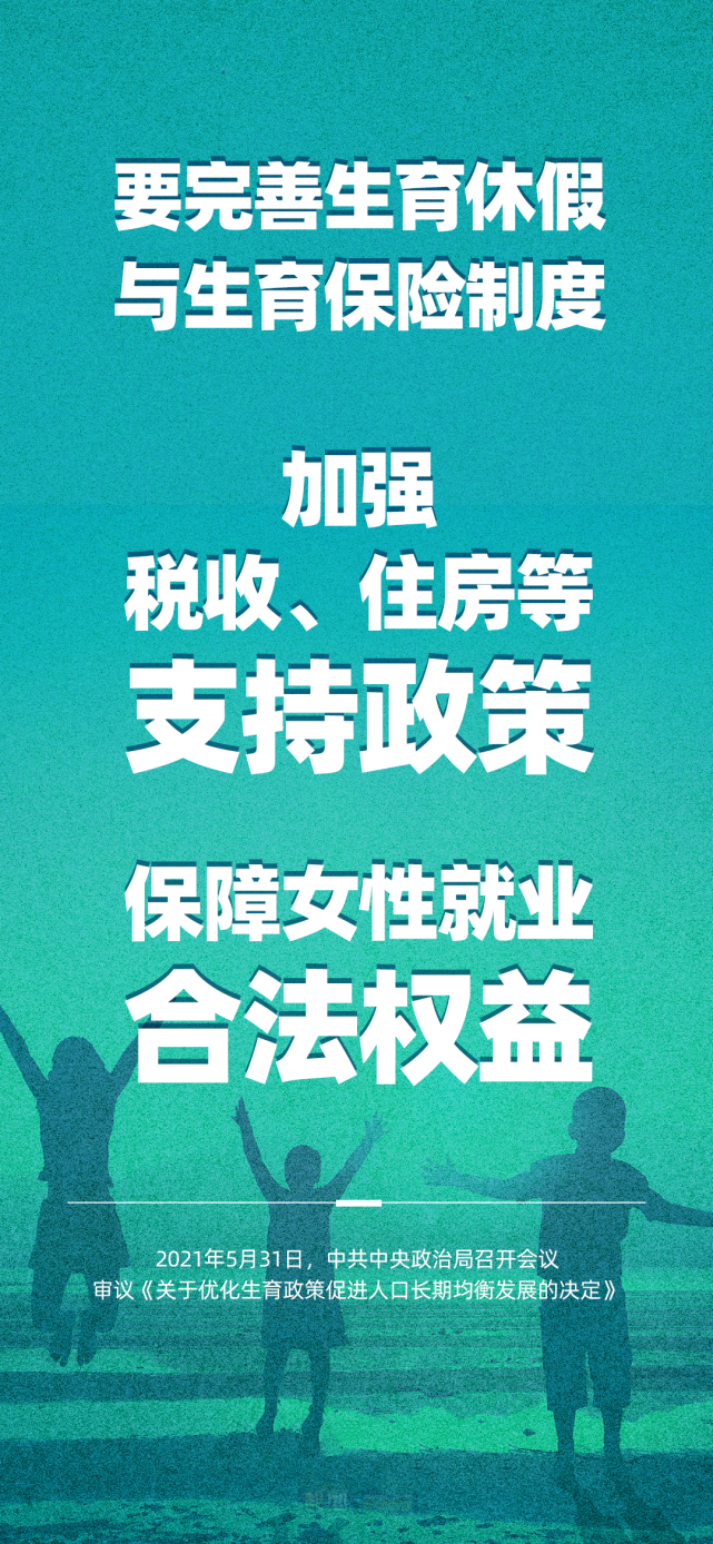 发布日期:2021-06-01 09:45:15 文章来源:招商武汉中共中央政治局5月31日召开会议,听取“十四五”时期积极应对人口老龄化重大政策举措汇报,审议《关于优化生育政策促进人口长期均衡发展的决定》。就积极应对人口老龄化、调整生育政策等问题,会议作出重磅部署。