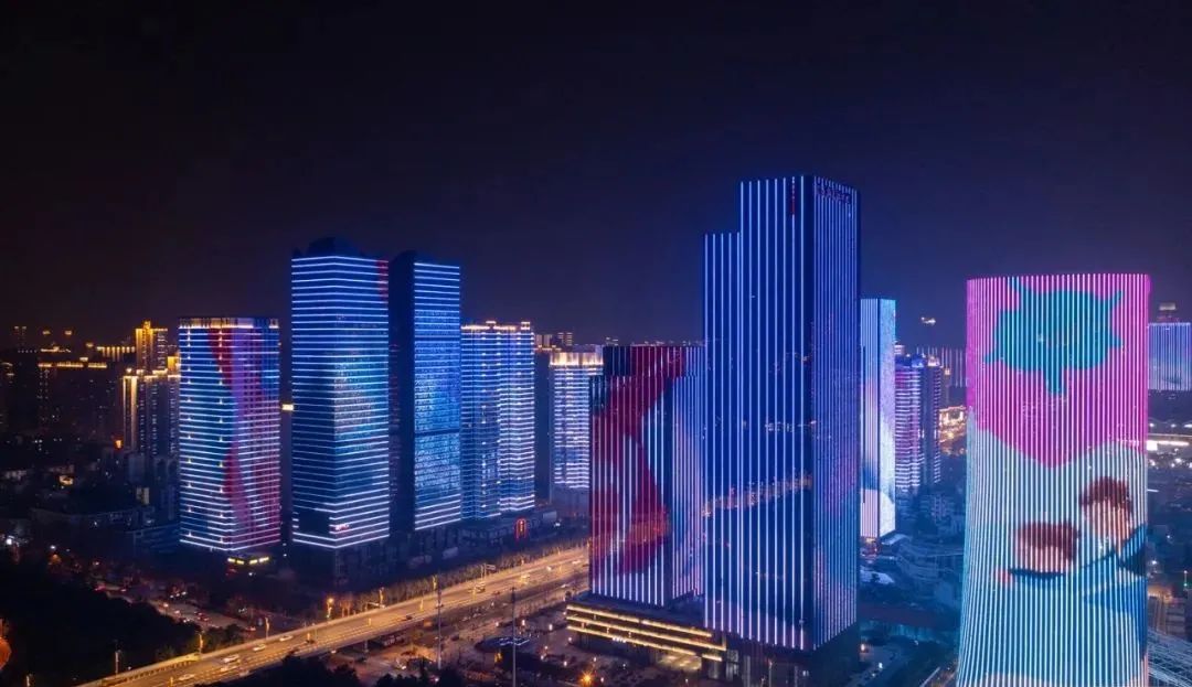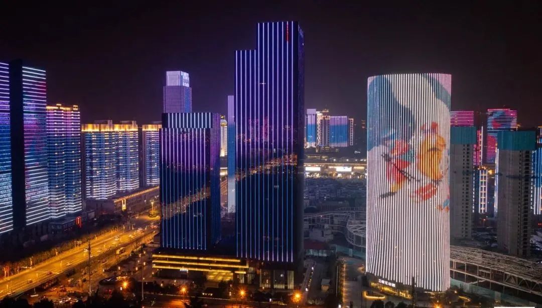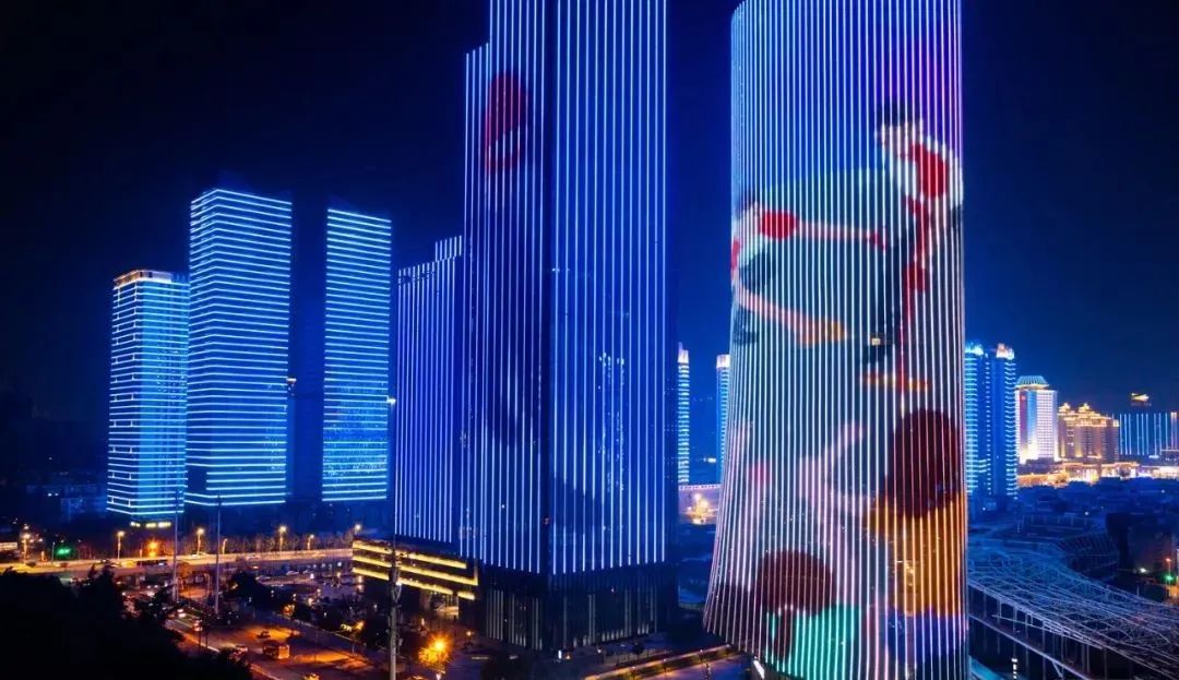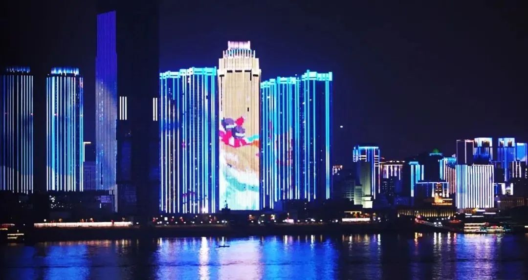 紧接着,花样滑冰、冰球、短道速滑、雪车等冰雪运动以动态画面形式出现在武汉长江二桥、天悦外滩金融中心等武汉地标上,光影倒映在江面。