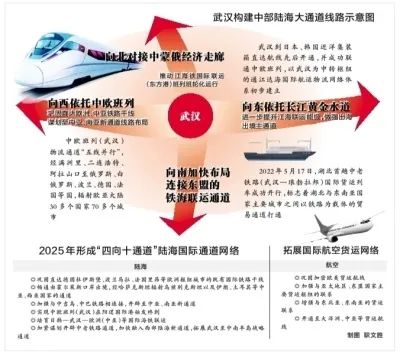铁路方面,中欧班列(武汉)物流通道“五线并行”,经满洲里、二连浩特、阿拉山口至俄罗斯、白俄罗斯、波兰、德国、法国等国,辐射欧亚大陆30多个国家70多个城市,成为畅通双循环的重要战略通道。