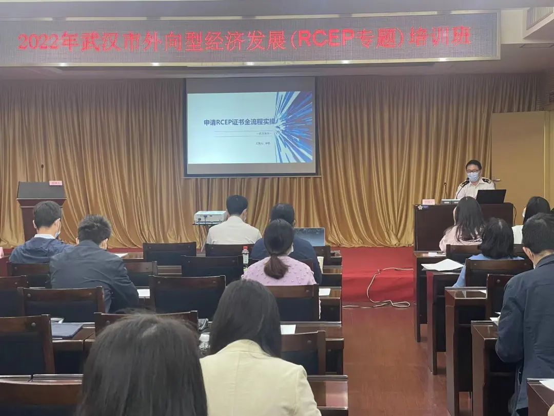 线下培训1天半(5月19日-20日上午),在武汉市商务局举办,面向外贸企业的相关人员,严格落实疫情防控要求,重点就RCEP与我国已实施自贸协定原产地规则对比、申请RCEP证书全流程实操、东南亚市场发展趋势及机会点、APEC商务旅行卡政策宣讲、对外贸易支持措施解读等方面的专业知识进行了学习讲解和外贸实操。