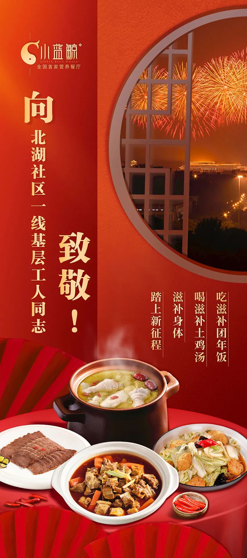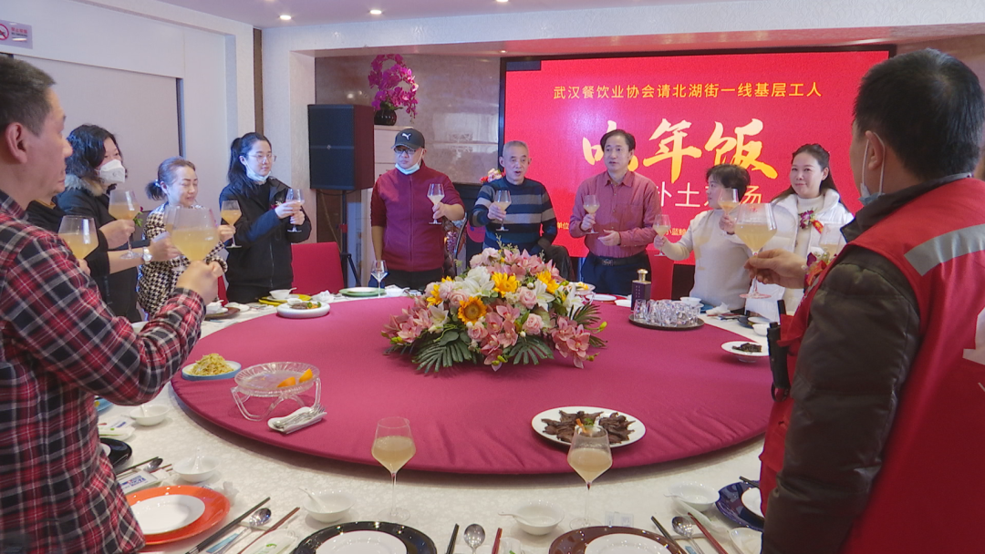 武汉市餐饮协会组织80余家餐饮企业推出首届“武汉煨汤滋补美食节”,为了表达对一线同志的敬意,2023年1月13日上午,武汉市餐饮协会请北湖街办事处一线工人同志在北湖街小南鲸酒楼吃年饭。