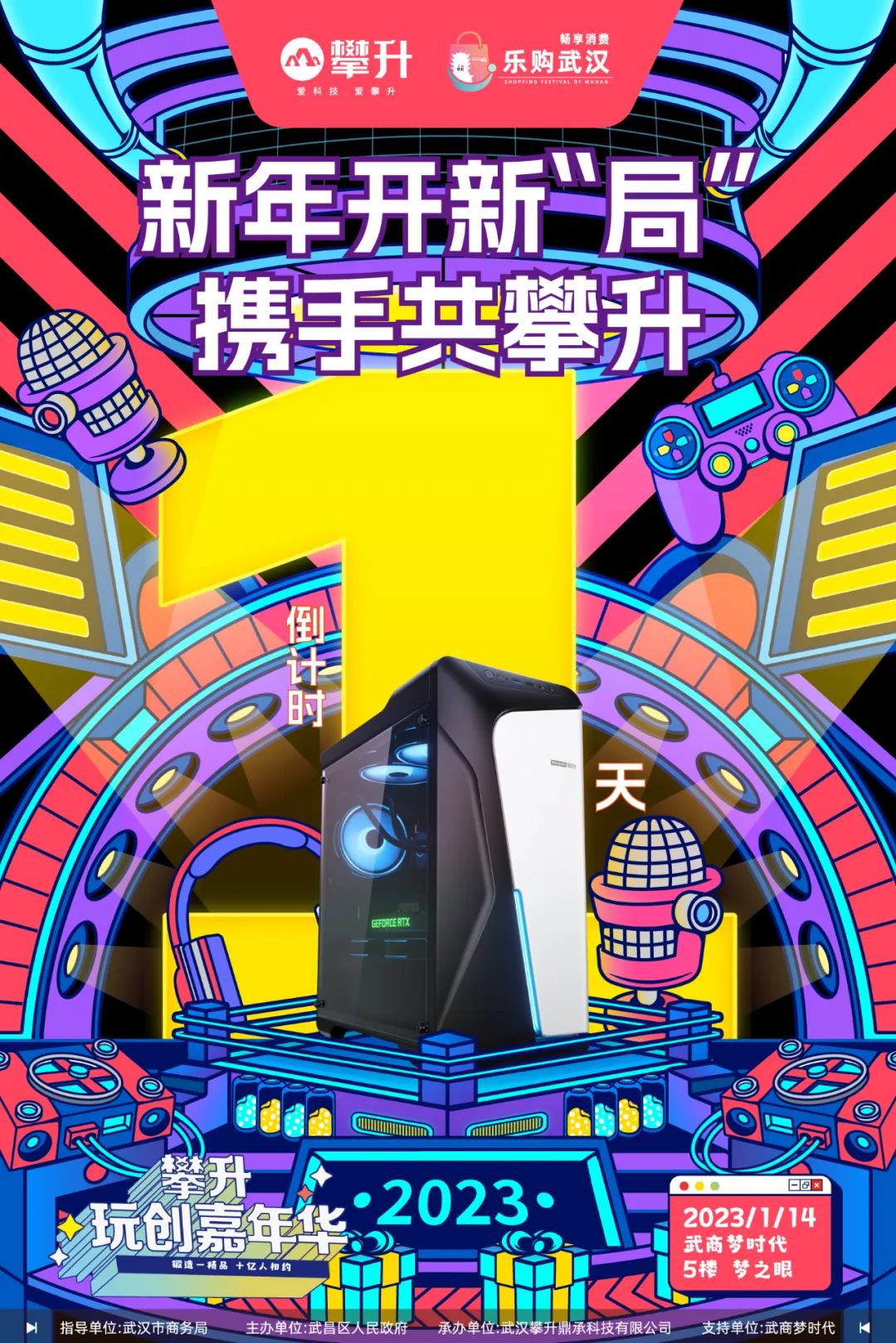 活动汇集攀升2023重磅新品全球首发、攀升IP联名产品首个线下巡展、武汉电竞高校联赛总决赛、英雄联盟coser秀、新年电音派对以及现场多个福利游园互动区,遵循“市区联合、政企联手、跨界联动、全民共享”原则,营造繁荣有序的消费氛围,点燃全新的消费季热情,让武汉人与武汉品牌来个亲密接触。