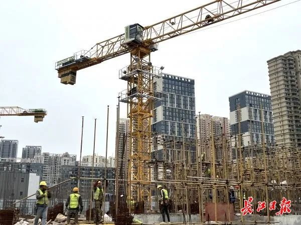 2月6日,在江岸区后湖大道与汉黄路交会处,新荣TOD天街综合体项目现场建设加快推进,施工人员整齐有序搬运着钢筋,塔吊、铲土车不停作业。