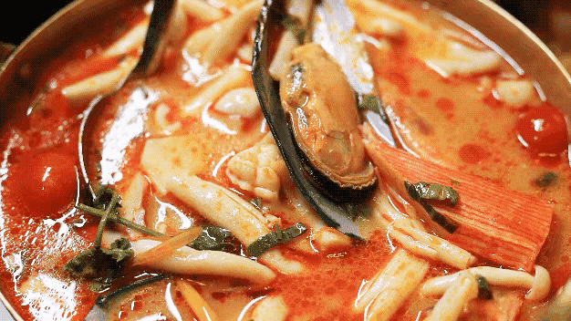 6小时慢火熬制浓稠馥郁的汤底,满满的鱿鱼、蛤蜊、青口,鲜虾……酸、辣、鲜、甜、咸多重口感达到平衡,一口下去简直鲜到颅内放烟花。
