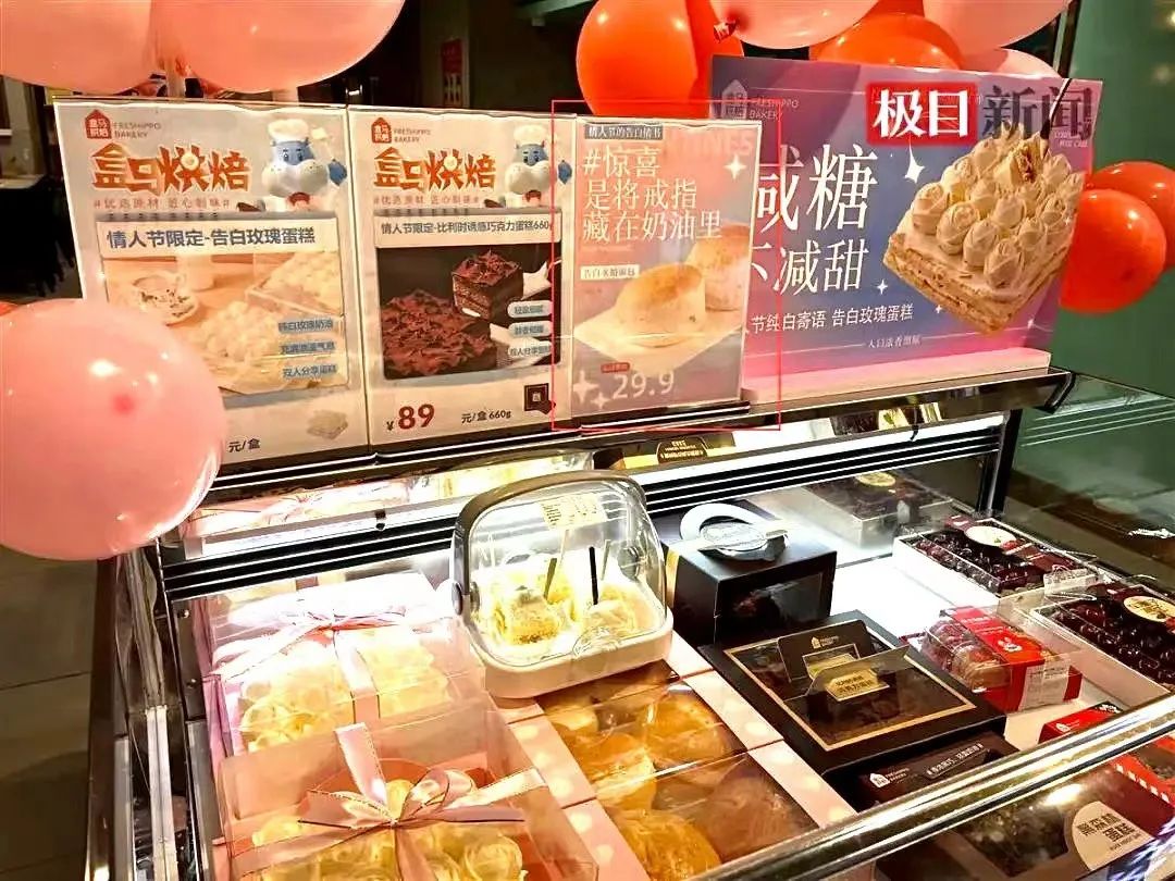 在盒马鲜生的糕点区,可以看到情人节专属告白玫瑰蛋糕和诱惑巧克力蛋糕,甚至还有“告白求婚面包”。这一面包中间特地夹入厚厚一层奶油,方便藏入戒指。