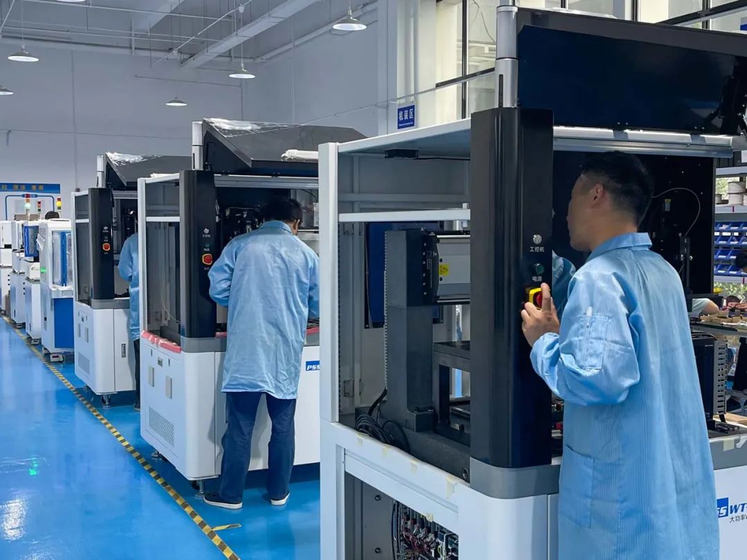 这是武汉普赛斯电子股份有限公司的生产人员对大功率VCSEL晶圆测试系统进行装配调试(2023年5月10日摄)。(新华社/图)