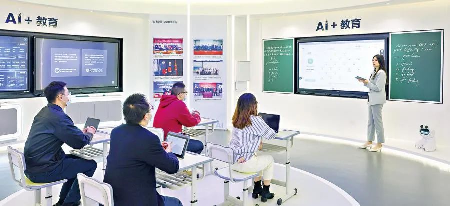 工作人员为客户演示如何使用科大讯飞研发的畅言智慧课堂