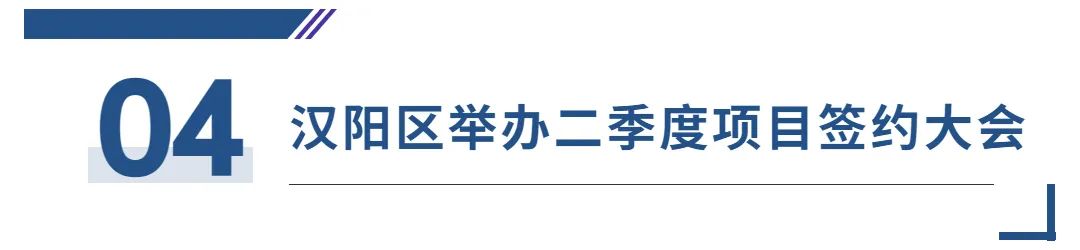 近日,汉阳区举办“2023年汉阳区招商推介暨二季度项目签约大会”,大会共签约亿元以上项目76个,总签约金额499.27亿元,高位推进招商引资“一号工程”,为汉阳高质量发展注入新动能、增添新活力。此次签约涵盖数字经济、智能制造、医疗健康、电商零售等诸多领域,锚定数字工业、金融投资、电商直播等新兴风口产业,契合汉阳“1+6”产业体系。