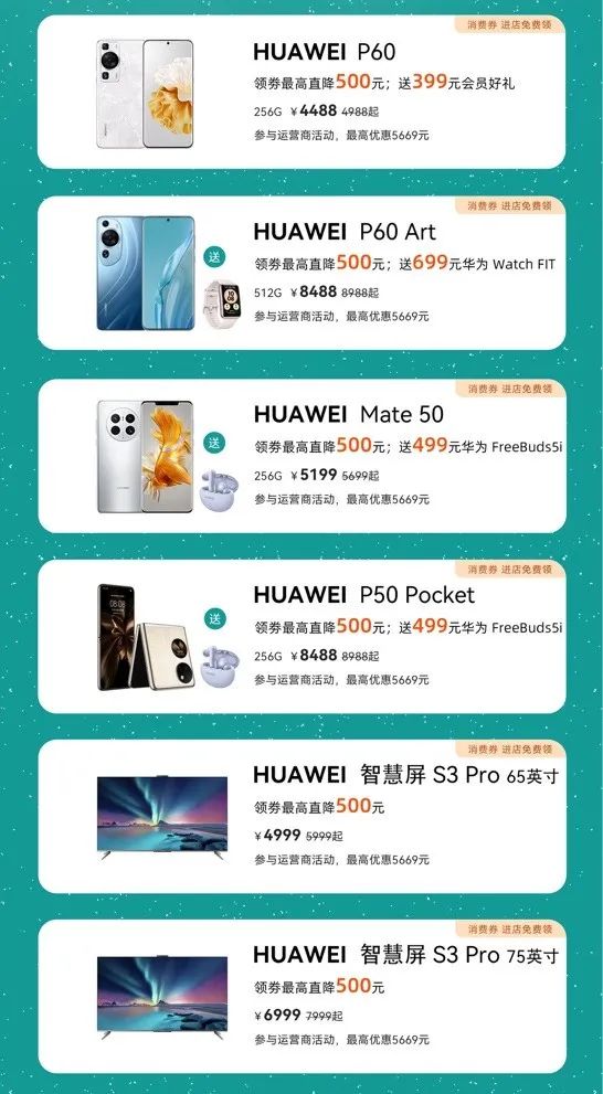 HUAWEI P60、HUAWEI P60 Art、HUAWEI Mate 50等爆款手机可享受折上折优惠。