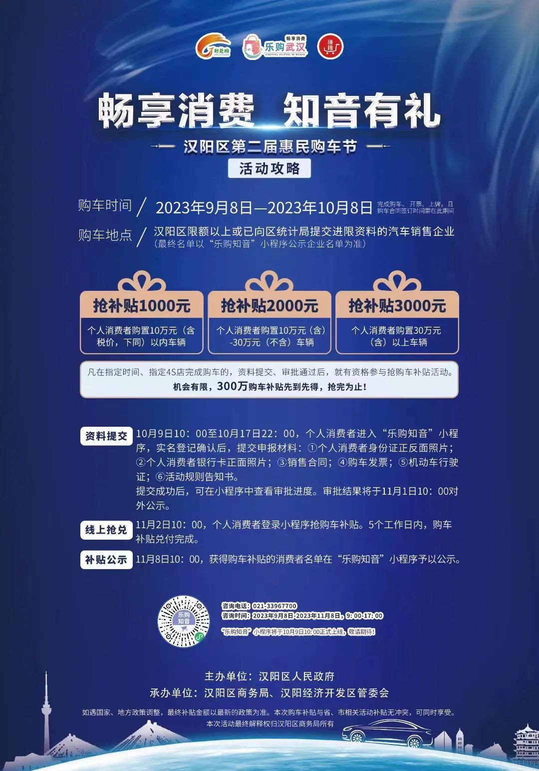发布日期:2023-09-11 08:46:59 文章来源:武汉商务9月8日,畅享消费,知音有礼——汉阳区第二届惠民购车节正式启动。9月8日至10月8日期间,个人消费者在汉阳区限额以上或已向区统计局提交进限资料的汽车销售企业(名单附后)购车,在享受商户折扣优惠同时,最高可获得政府3000元现金补贴。