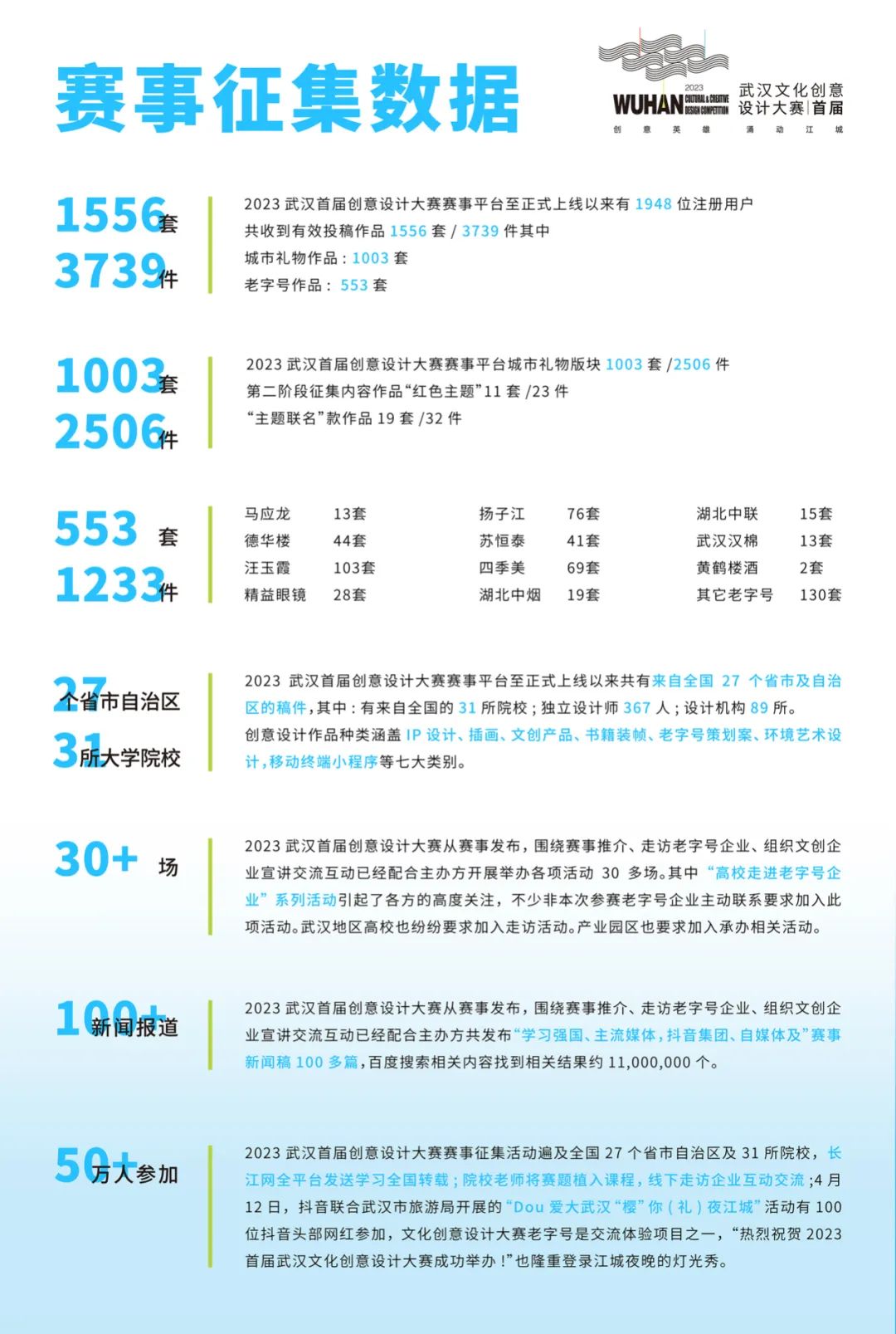 “创意英雄 涌动江城”2023武汉首届文化创意设计大赛赛事平台正式上线以来,历经123天的广泛宣传征集,大赛共收到来自全国27个省(自治区)、1948位注册用户的1556套(3739件)创意设计作品,其中包括“武汉礼物”作品1003套,“武汉老字号”作品553套,创意设计作品种类涵盖IP设计、插画、文创产品、书籍装帧、老字号策划案、应用程序APP、环境艺术设计等七大类别。