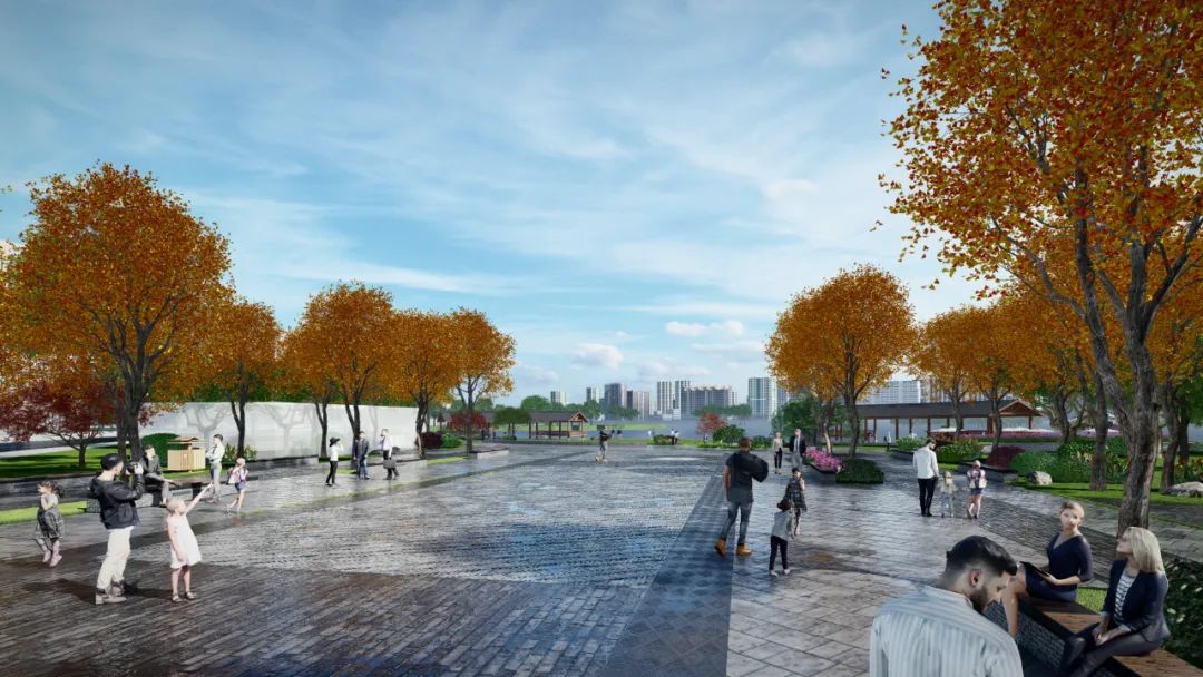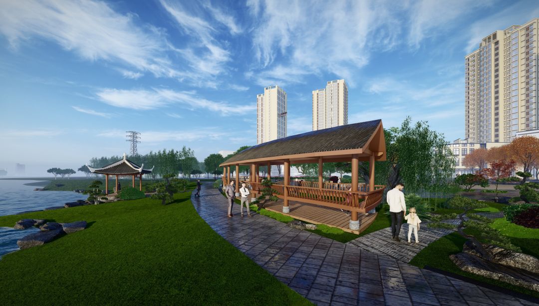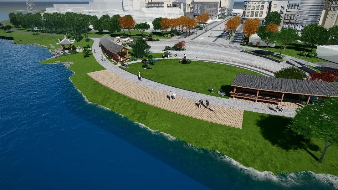 继续往里走,临湖的滨水活动码头映入眼前,未来在这里将会举办龙舟节、环湖游船等活动,让游客们在此尽享汉阳的畅快与怡然。