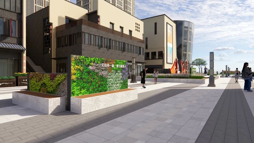 △茶文化轴线中部的文化舞台和中轴两侧的绿植墙体效果图。