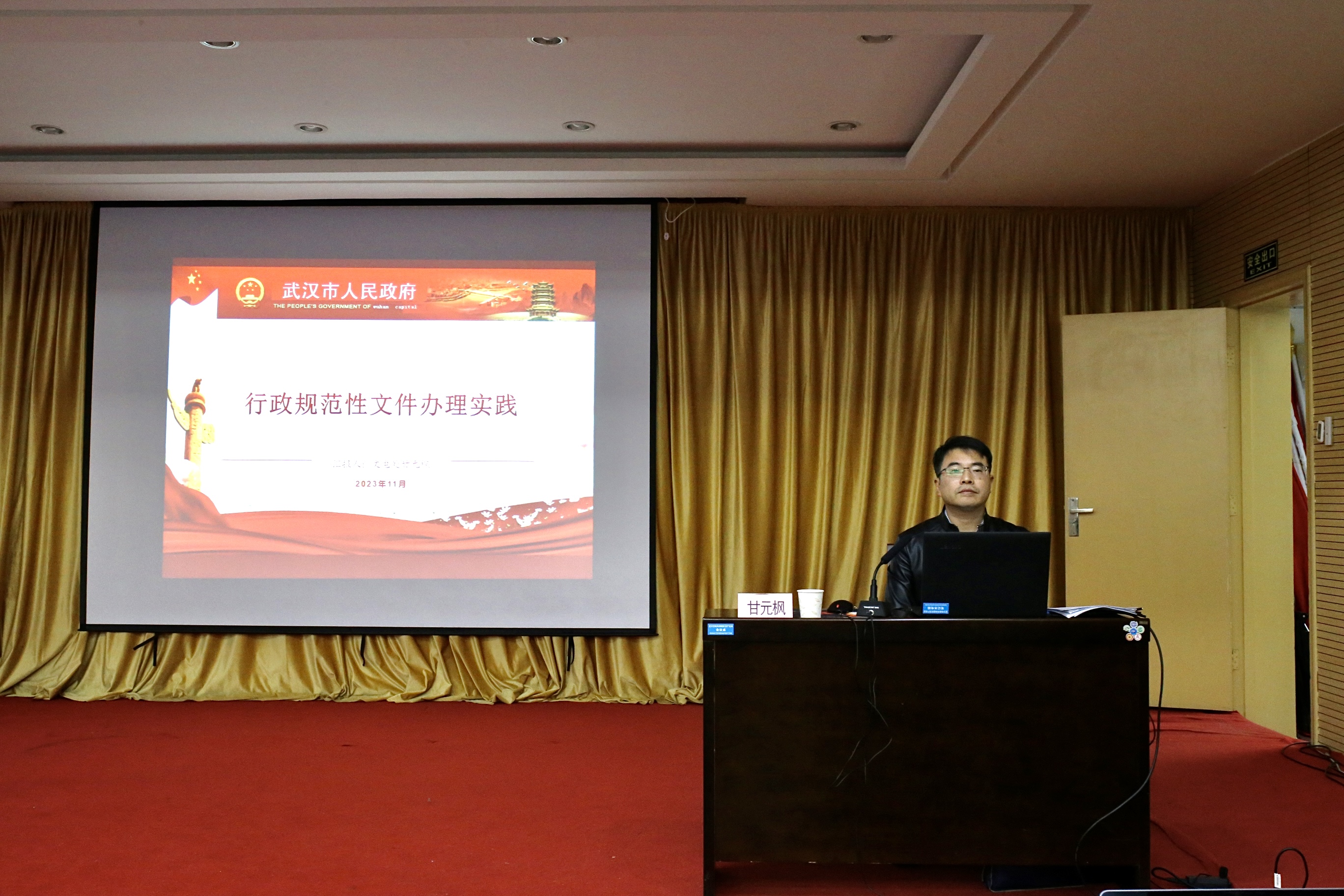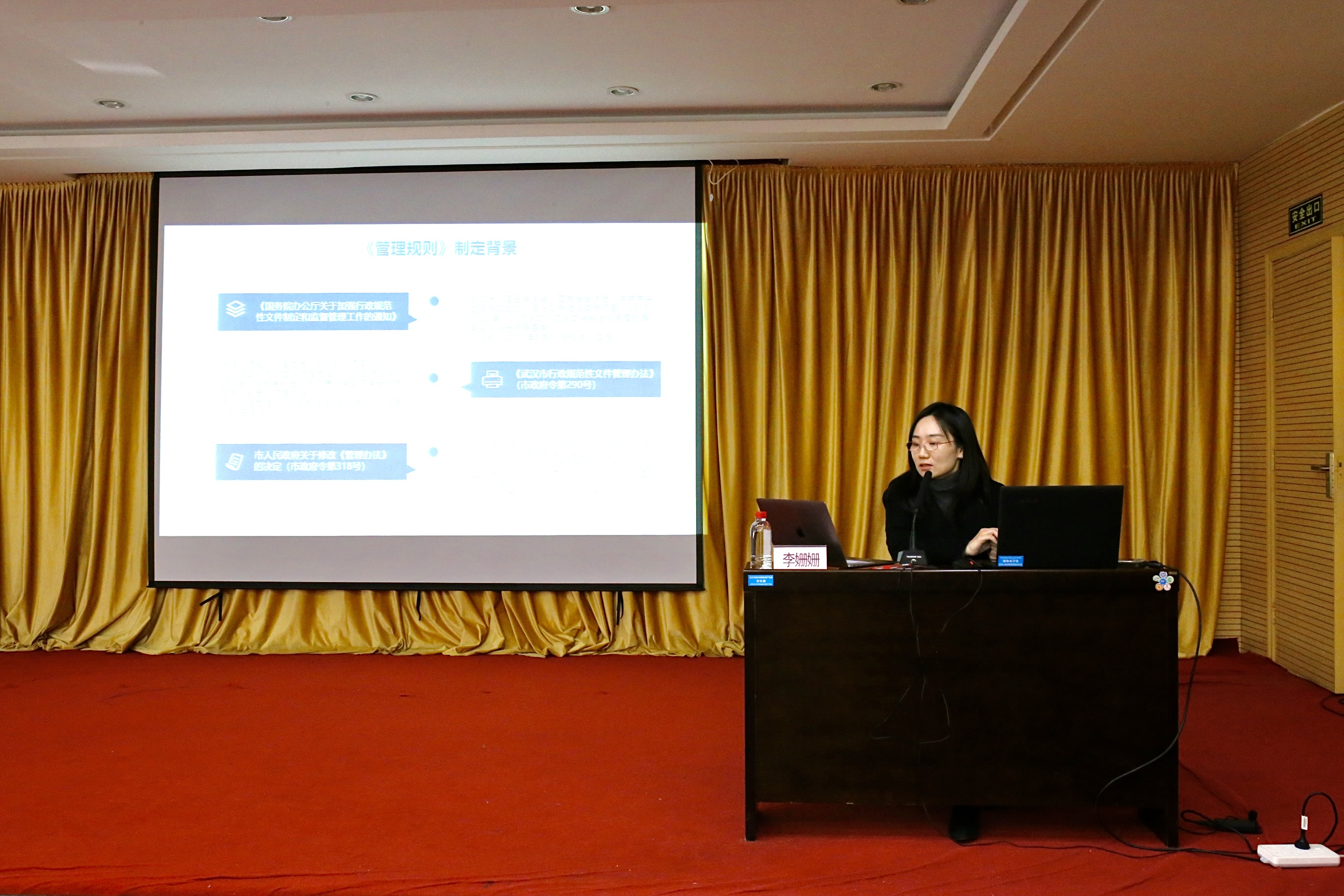 市政府办公厅文电处处长甘元枫同志应邀作专题辅导授课。他从行政规范性文件概念、办理程序和文件起草审核注意事项三个方面,结合武汉市大量实践案例,深入浅出地讲解了行政规范性文件的基本内涵、外延及实践要求。市商务局法律顾问、湖北得伟君尚律师事务所李姗姗律师结合法制审查经验,对《武汉市商务局行政规范性文件管理规则》进行了解读。