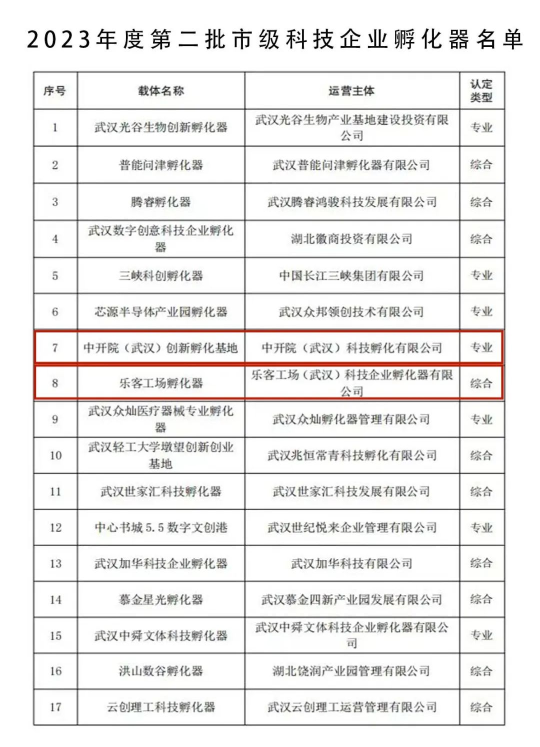 发布日期:2023-11-20 08:16:59 文章来源:投资武汉近日,武汉市科技局公布了2023年度第二批市级科技企业孵化器认定和众创空间备案名单,武汉经开区璞跃中国武汉创新中心、车谷智创园两家众创空间,中开院(武汉)创新孵化基地、乐客工场(武汉)科技企业孵化器两家孵化器载体成功上榜。