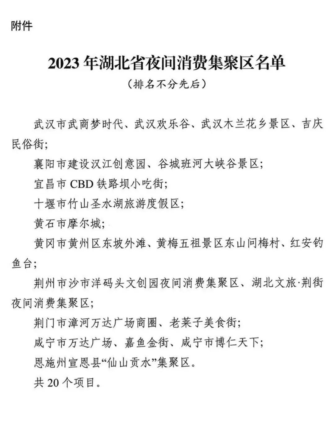 发布日期:2023-11-20 08:26:09 文章来源:武汉商务近日,“2023年湖北省夜间消费集聚区”名单公布,武汉4个项目榜上有名。据了解,此次评选由湖北省发改委联合省商务厅、省文旅厅、省财政厅等部门,对全省各市州申报的夜间消费集聚区项目进行评审并向社会公示,涵盖街区、综合体、旅游景区等多个类别。其中,武商梦时代以其丰富的业态、优质的服务为消费者提供了全新的夜间消费体验,进一步推动夜间经济的消费活力,成为入选项目之一。