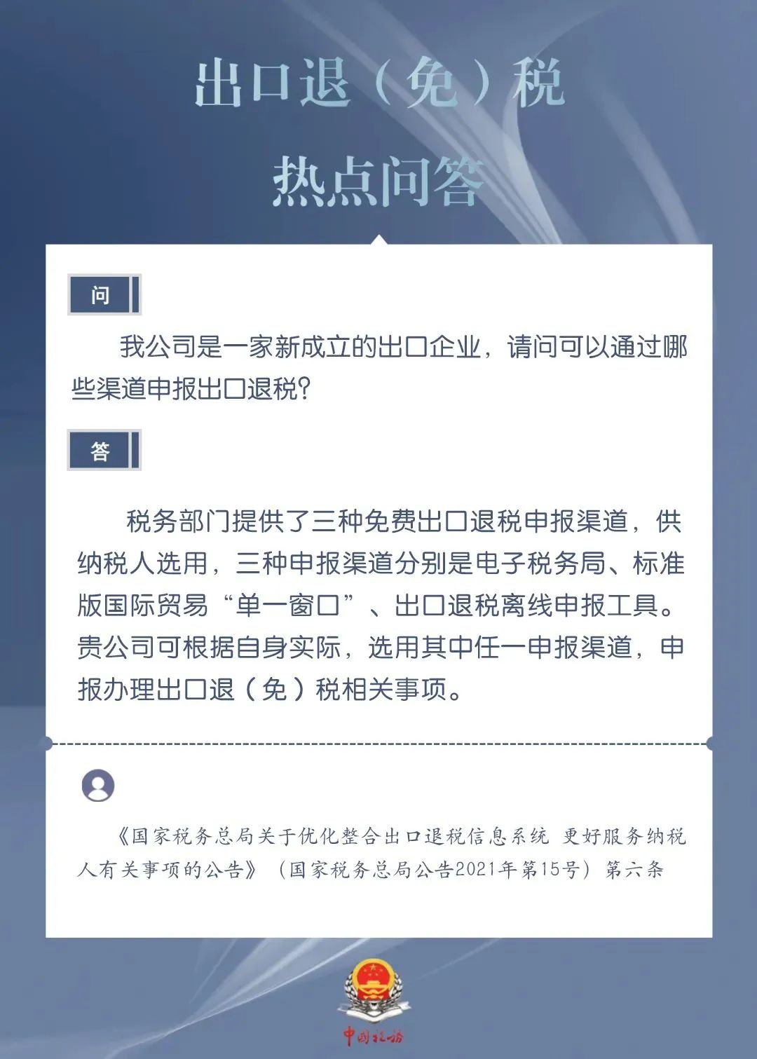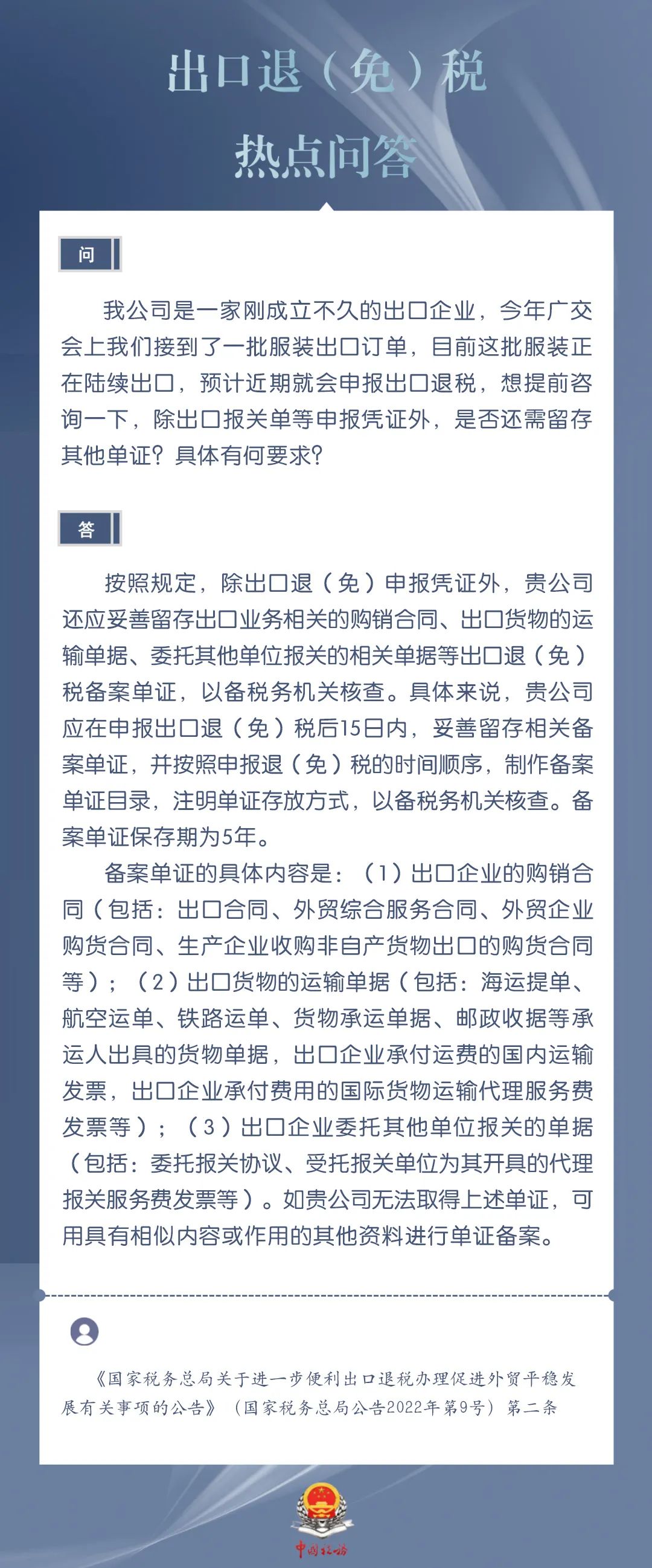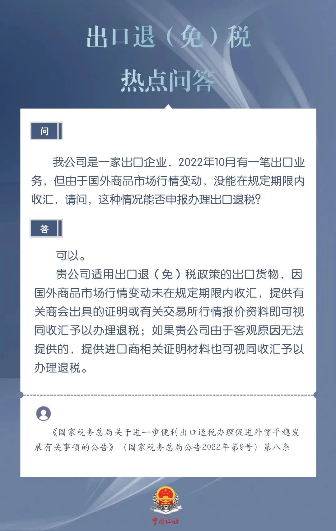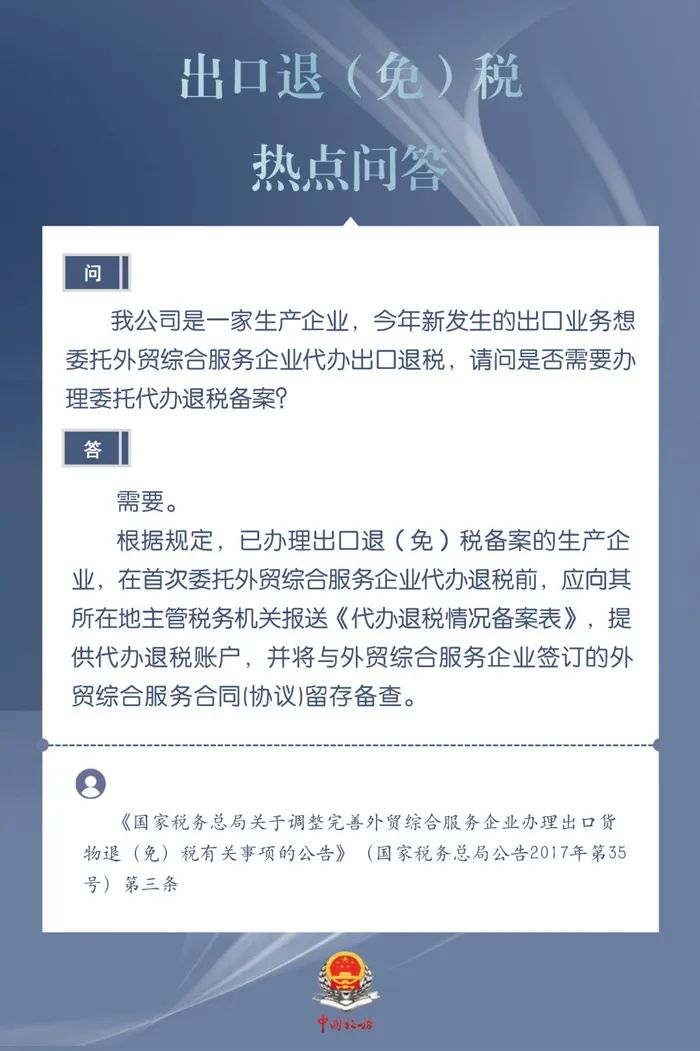 发布日期:2024-03-20 08:59:44 文章来源:武汉商务为进一步加力支持包括中小微企业在内的广大经营主体开展外贸出口业务,便于企业掌握出口退税现行规定、及时了解出口退税便利化举措,商务部、国家税务总局针对企业普遍关心的出口退税热点问题,整理了问答集锦。一起来看看吧!