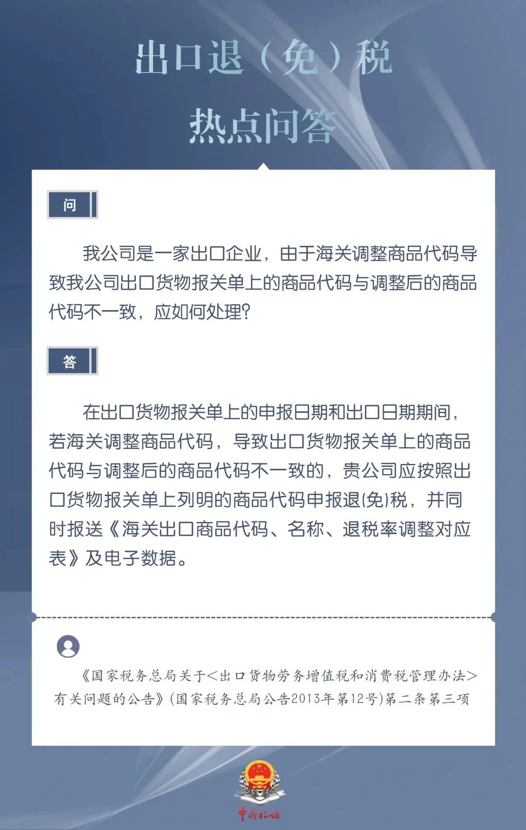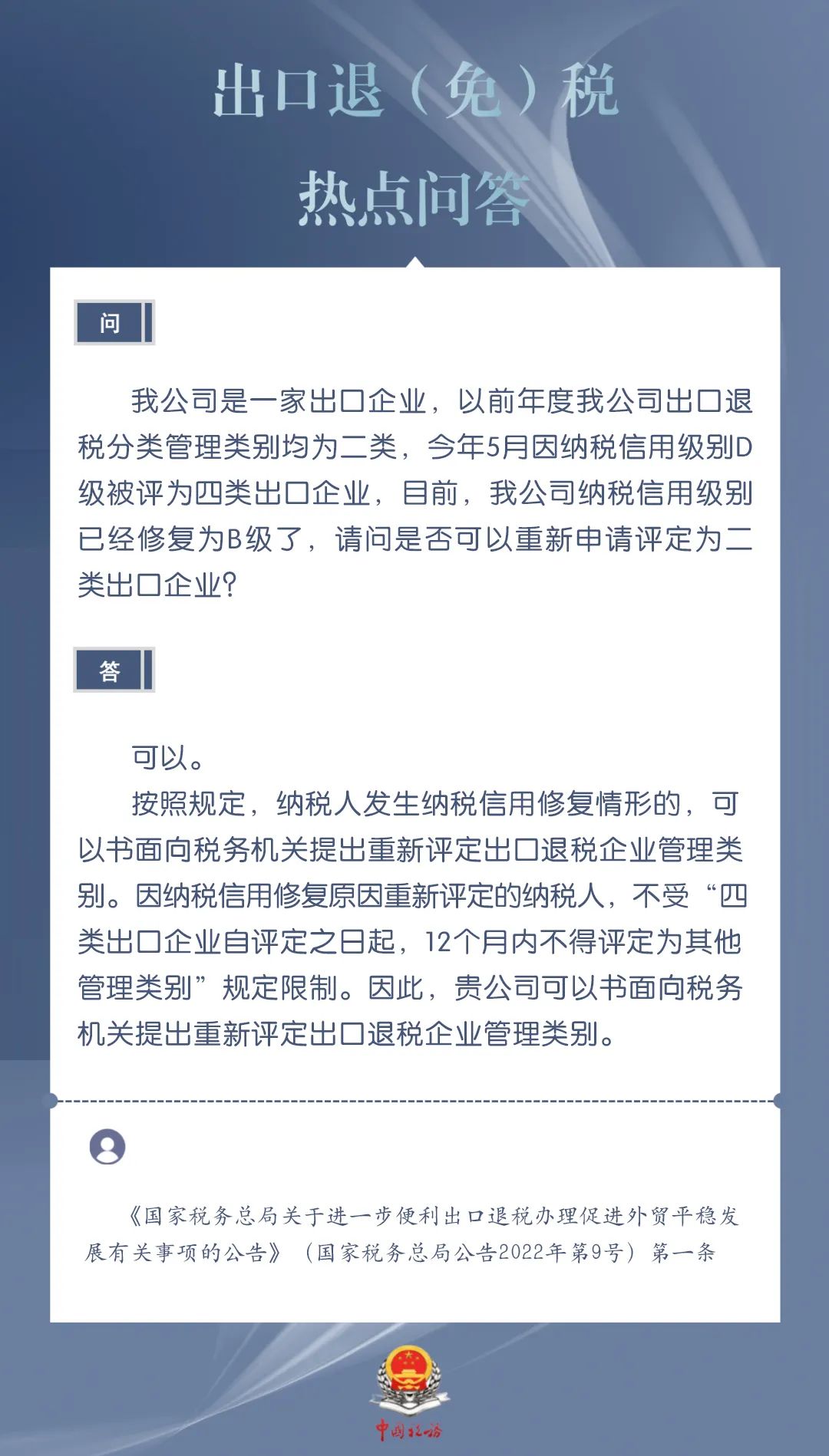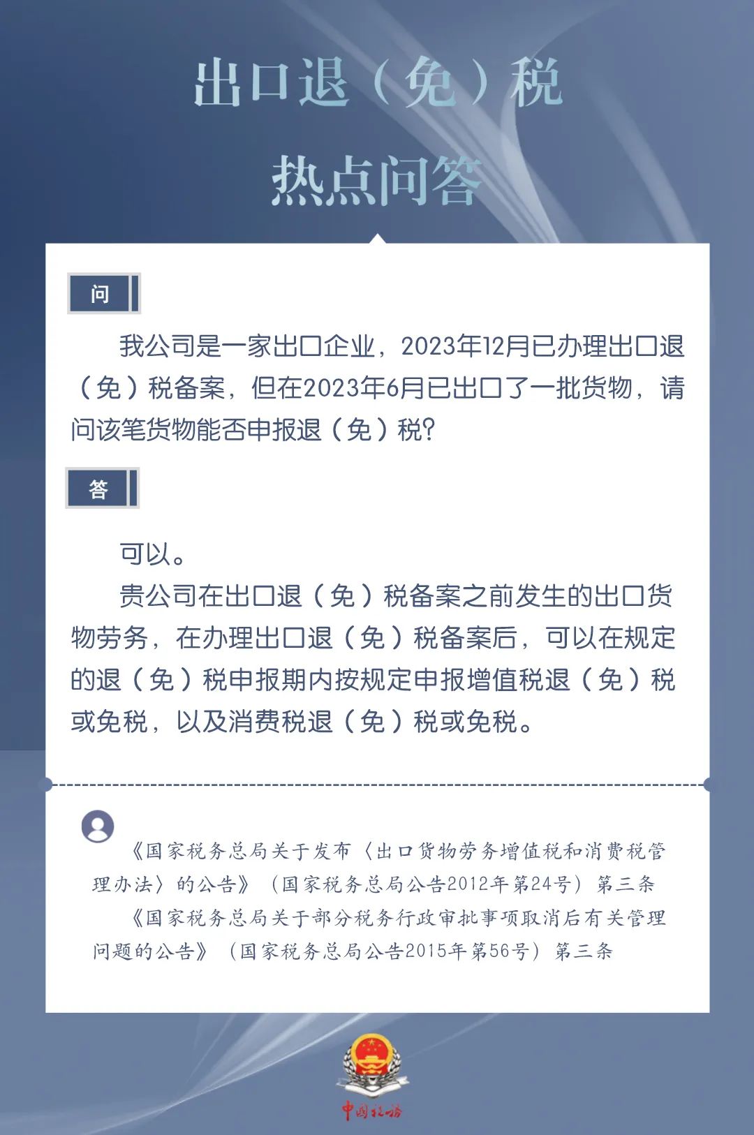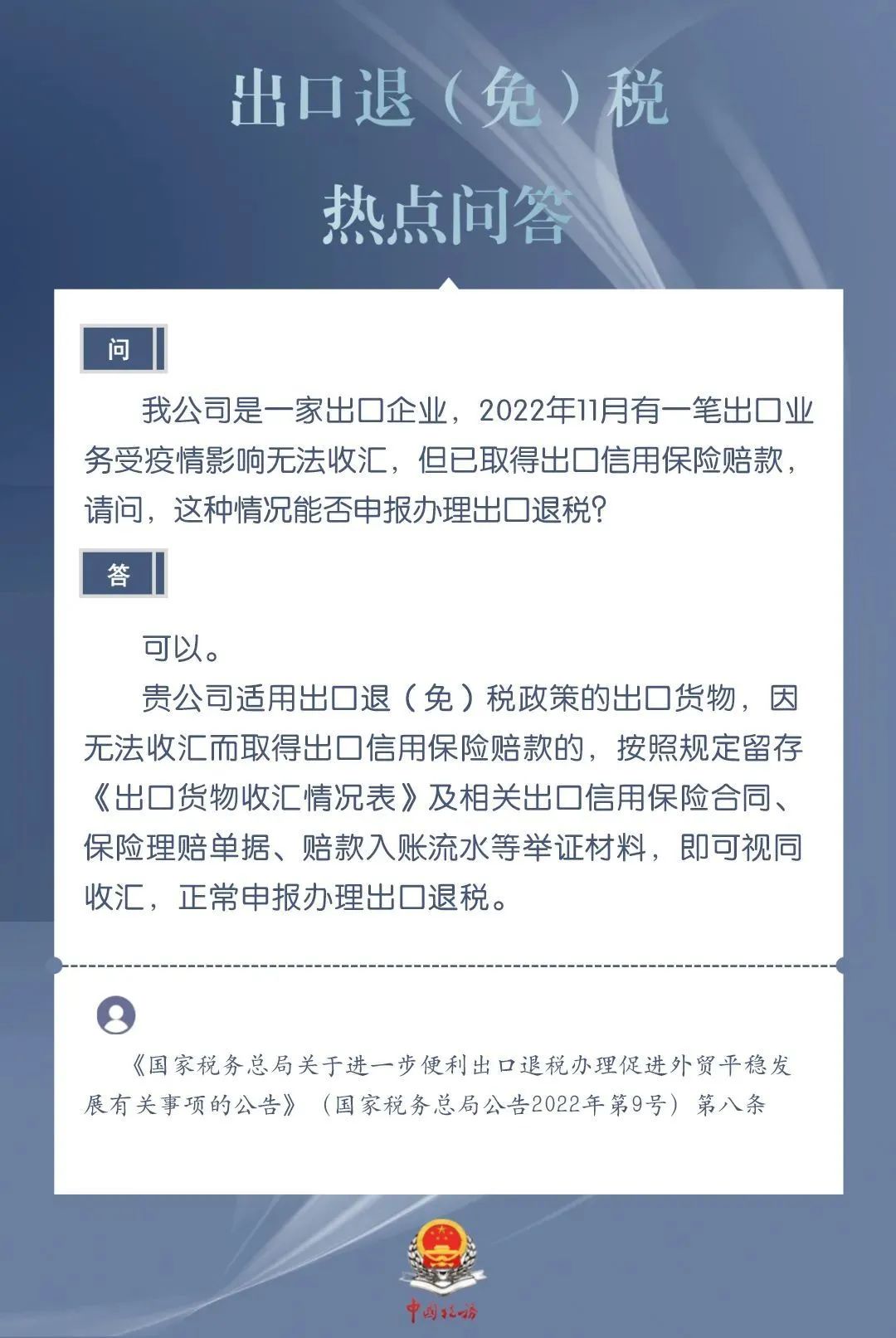 发布日期:2024-03-20 08:59:44 文章来源:武汉商务为进一步加力支持包括中小微企业在内的广大经营主体开展外贸出口业务,便于企业掌握出口退税现行规定、及时了解出口退税便利化举措,商务部、国家税务总局针对企业普遍关心的出口退税热点问题,整理了问答集锦。一起来看看吧!