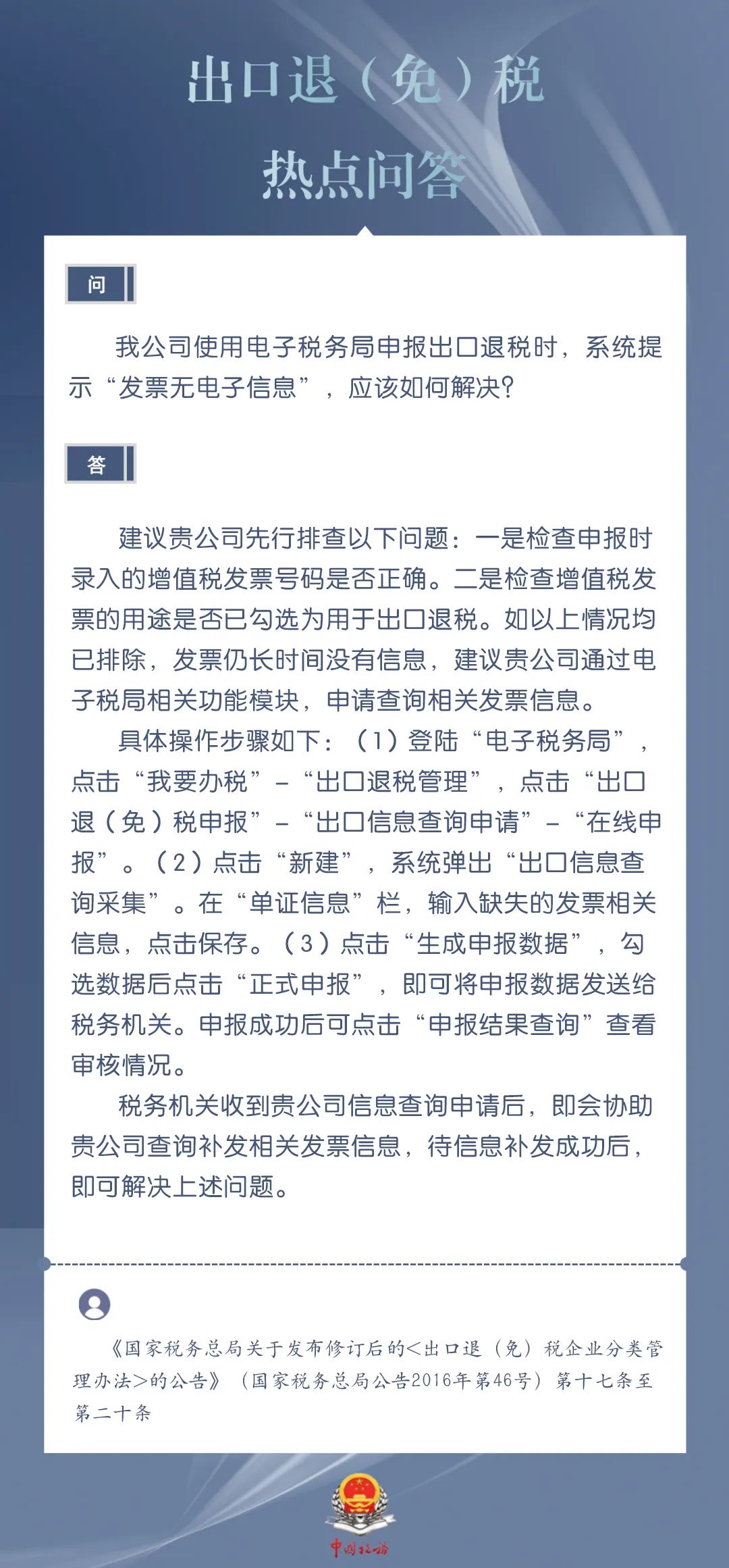 申报出口退税时,电子税务局系统提示“发票无电子信息”如何解决?